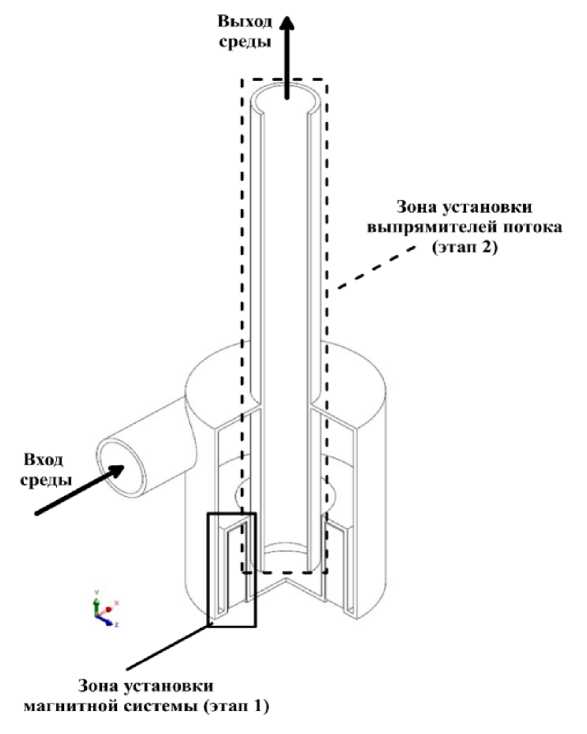 Схема магнитогидродинамического фильтра с зонами проточной части, подвергшимися модернизации, приведена на рис. 1.