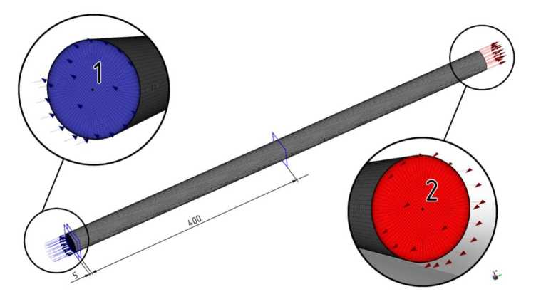 Рис. 3. Расчетная модель: 1 – центр тяжести входного сечения; 2 – центр тяжести выходного сечения