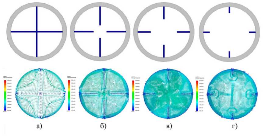 Рис. 4. Геометрия выпрямителей и поля скорости в характерном сечении для: а – крестообразной вставки; б – прямых ребер 13,5 мм; в – прямых ребер 9 мм; г – прямых ребер 4,5 мм