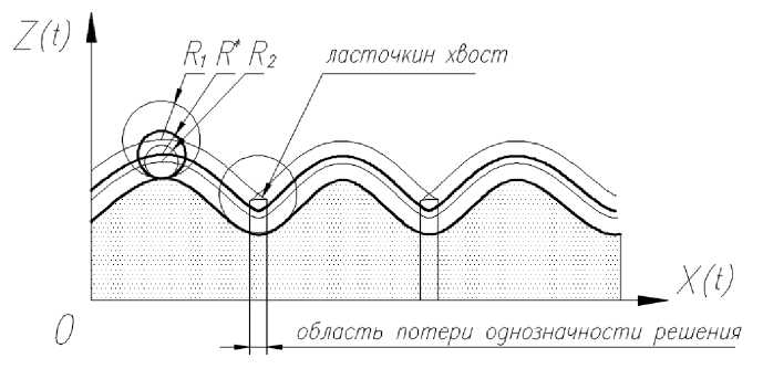 Особо следует отметить пример 4: одной из важных интерпретаций решений (14) графиков рис. 5 является их соответствие кривой, описываемой центром колеса при качении по неровному профилю дороги [6]. Однако данная интерпретация осложняется нарушением гладкости решений уравнения (12): при малом радиусе колеса относительно кривизны профиля опорной поверхности, решения (14) соответстуют уравнениям эквидистанты к кривой, заданной параметрически, которые выводятся из элементарных соображений дифференциальной геометрии; при увеличеннии радиуса колеса (или увеличении кривизны профиля) возникает так называемая градиентная катастрофа, которая характеризуется потерей гладкости и однозначности решения. Градиентная катастрофа, в интерпретации качения колеса по неровному профилю, означает критическое значение радиуса колеса , когда возникает двухточечный контакт при перекатывании через яму (лакуну). При значениях радиуса колеса R*, больших критического значения, имеет место неоднозначность в решении уравнения (12), из-за появления «ласточкиных хвостов» (рис. 7).