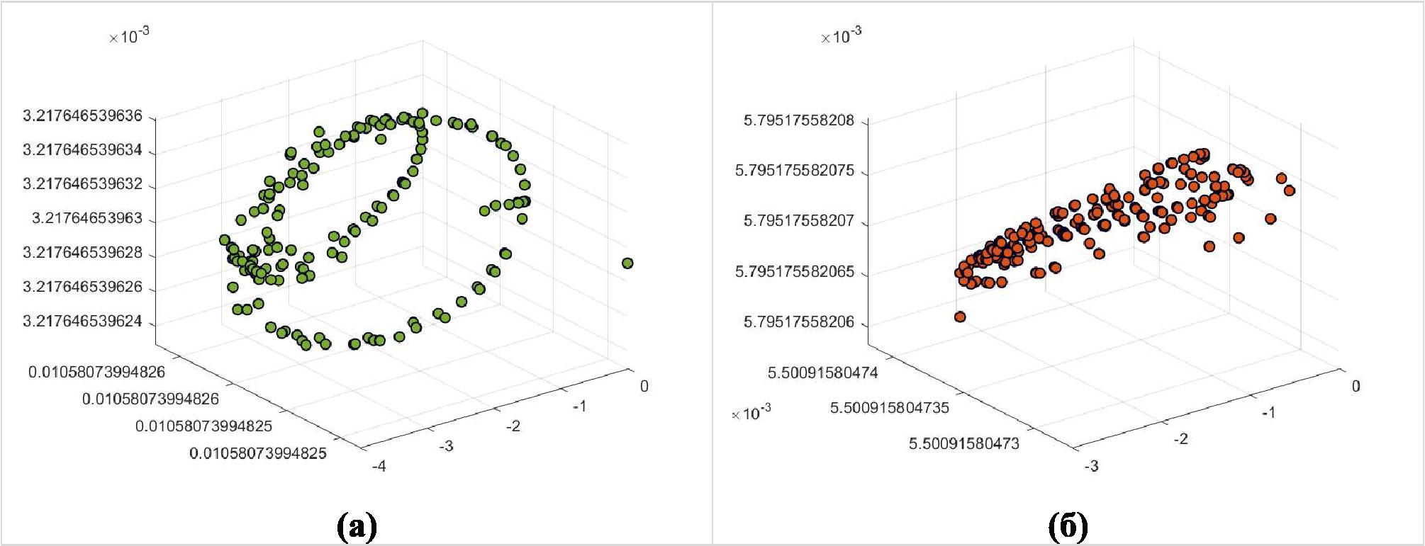 Далее предлагаемый метод используется для обнаружения аномалий в сигнале напряжения. АКФ рассчитывается при длине окна d=3. АКФ нормального напряжения и напряжения при падении показана на рис. 5 в трехмерном пространстве.