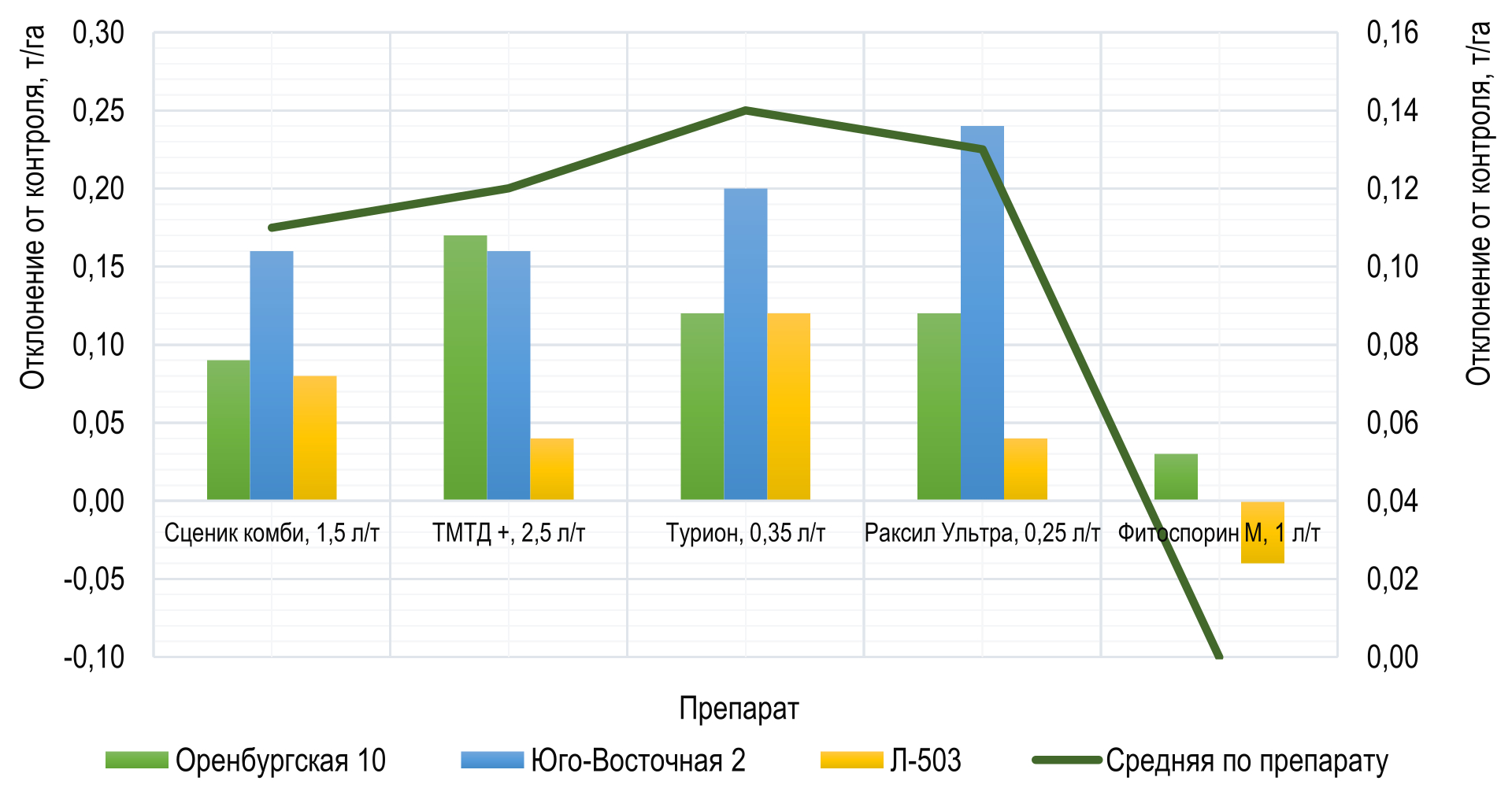 Влияние предпосевной обработки семян на урожайность пшеницы сорта Л-503 было самым низким за четырёхлетний период. Только при применении протравителя Турион (0,35 л/т) прибавка урожайности оказалась равной прибавке сорта Оренбургская 10 (0,12 т/га), однако в относительном выражении она была ниже на 1,3 п.п. При применении препарата Фитоспорин М (1 л/т) наблюдалась отрицательная к контролю прибавка урожайности, составившая 0,04 т/га или 4,3%.