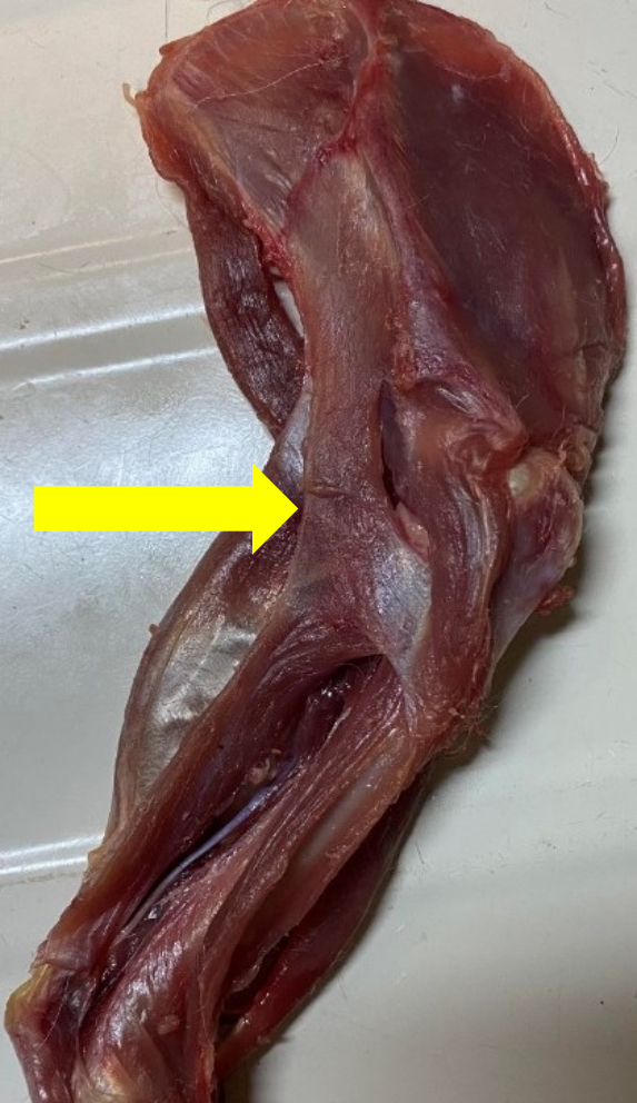 Рис. 2. Анатомическая картина мышц грудной конечности кошки-метиса в возрасте 3 лет. Консолидация лопаточной части дельтовидной мышцы с латеральной головкой трехглавой мышцы плеча. Оригинальный макропрепарат