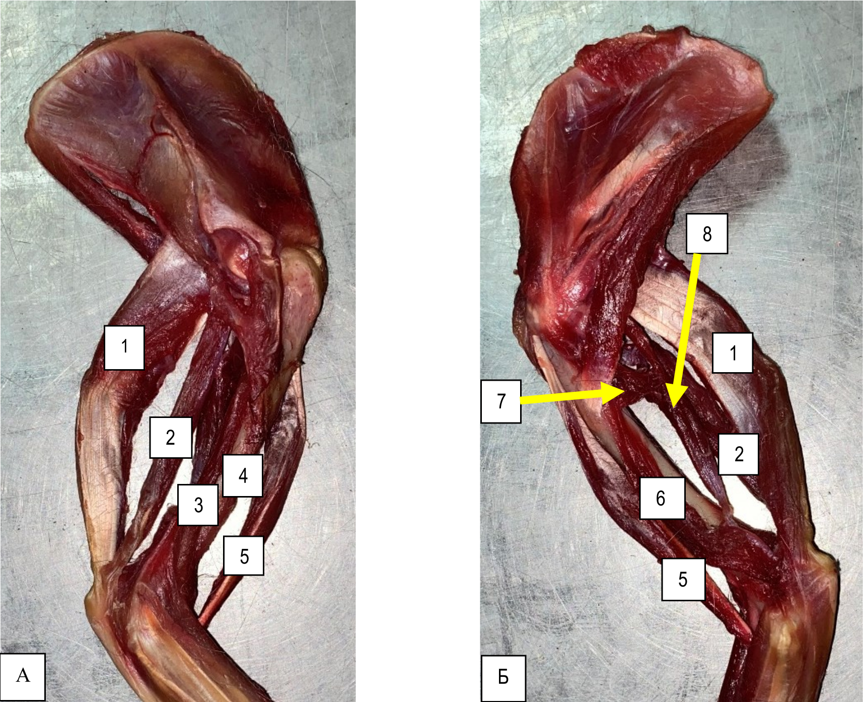 Рис. 3. Анатомическая картина мышц локтевого сустава кошки-метиса в возрасте 5 лет (оригинальный макропрепарат): А – латеральная поверхность; Б – медиальная поверхность; 1 – длинная головка трехглавой мышцы плеча; 2 – латеральная головка трехглавой мышцы плеча; 3 – плечевая мышца; 4 – дельтовидноплечевая мышца; 5 – двуглавая мышца плеча; 6 – медиальная головка трехглавой мышцы плеча; 7 – медиальная добавочная головка трехглавой мышцы плеча; 8 – латеральная добавочная головка трехглавой мышцы плеча
