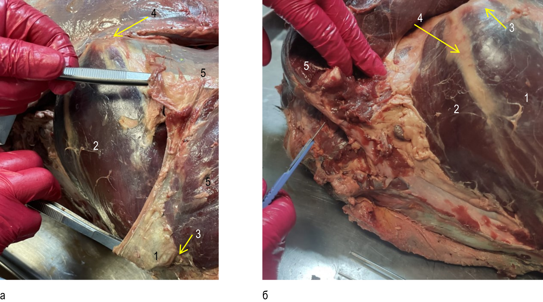 Рис. 1. Макропрепарат каудальной части туловища и тазовой конечности пятнистого оленя: а – расположение средней ягодичной мышцы: 1 – сухожильная часть ягодично-двуглавой мышцы (после удаления ягодично-двуглавой мышцы); 2 – средняя ягодичная мышца; 3 – подвздошный бугор подвздошной кости (маклок); 4 – большой вертел бедренной кости; 5 – напрягатель широкой фасции бедра; б – границы ягодичной и грушевидной частей средней ягодичной мышцы: 1 – ягодичная головка средней ягодичной мышцы; 2 – грушевидная головка средней ягодичной мышцы; 3 – большой вертел бедренной кости; 4 – наружняя граница между ягодичной и грушевидной головками средней ягодичной мышцы; 5 – полуперепончатая мышца