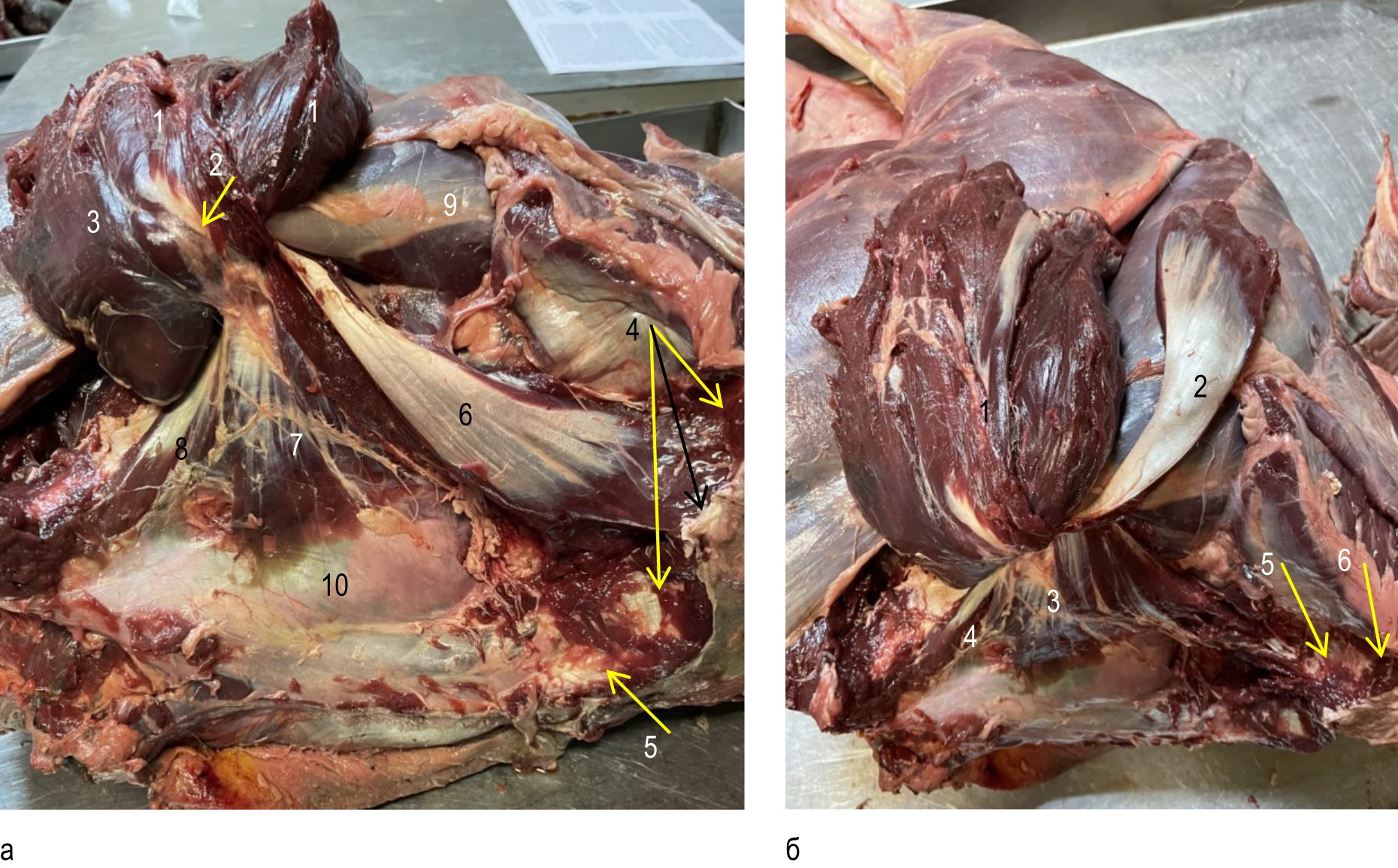 Рис. 2. Макропрепарат каудальной части туловища и тазовой конечности пятнистого оленя: а – место закрепления средней ягодичной мышцы в проксимальной части (здесь она срезана в проксимальной части и вывернута на большом вертеле): 1 – ягодичная часть средней ягодичной мышцы; 2 – дистальное сухожилие средней ягодичной мышцы; 3 – грушевидная часть средней ягодичной мышцы; 4 – место закрепления ягодичной части; 5 – место закрепления грушевидной части средней ягодичной мышцы на крыле подвздошной кости; 6 – добавочная ягодичная мышца; 7 – глубокая ягодичная мышца; 8 – внутренняя запирательная мышца; 9 – четырёхглавая мышца бедра; 10 – крестцово-седалищная связка (широкая тазовая связка); б – добавочная ягодичная мышца срезана в проксимальной части: 1 – средняя ягодичная мышца; 2 – добавочная ягодичная мышца; 3 – глубокая ягодичная мышца; 4 – внутренняя запирательная мышца; 5. ягодичная линия крыла подвздошной кости; 6 – проксимальная точка закрепления добавочной ягодичной мышцы