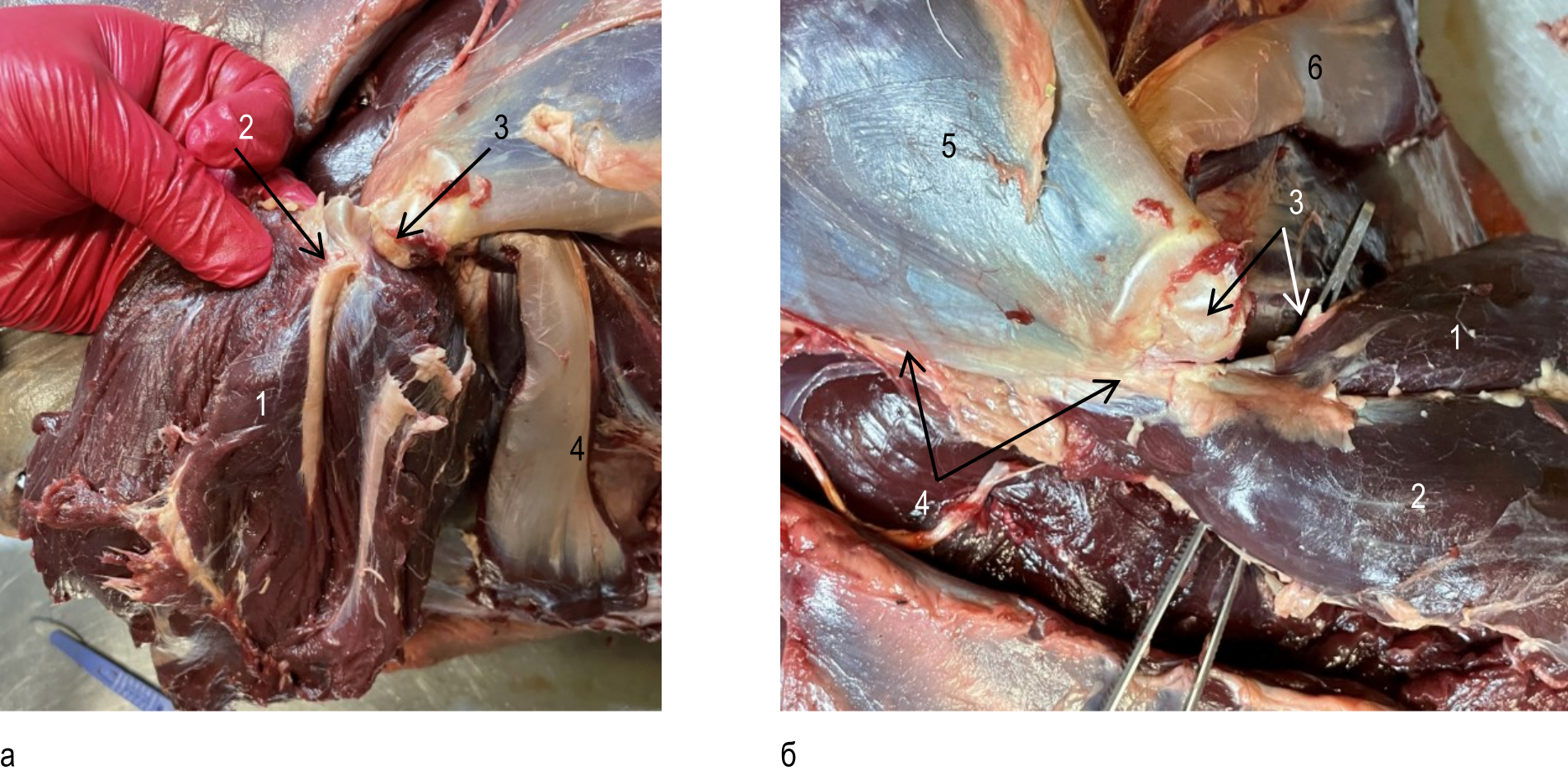 Рис. 3. Макропрепарат каудальной части туловища и тазовой конечности пятнистого оленя: а – с внутренней поверхности средней ягодичной мышцы: 1 – средняя ягодичная мышца; 2 – сухожилие ягодичной части средней ягодичной мышцы (срезана); 3 – точка закрепления средней ягодичной мышцы на большом вертеле бедренной кости; 4 – добавочная ягодичная мышца; б – с наружной поверхности средней ягодичной мышцы: 1 – ягодичная часть; 2 – грушевидная часть средней ягодичной мышцы; 3 – точка закрепления ягодичной части на большом вертеле бедренной кости; 4 – точки закрепления грушевидной части мышцы; 5 – четырёхглавая мышца бедра; 6 – добавочная ягодичная мышца