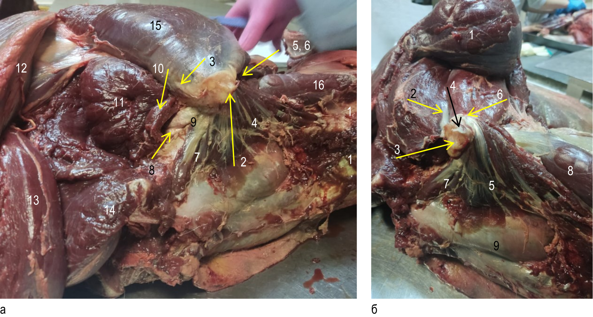 Рис. 4. Макропрепарат каудальной части туловища и тазовой конечности пятнистого оленя: а – глубокие мышцы в области тазобедренного сустава: 1 – крыло подвздошной кости (место закрепления средней и добавочной ягодичных мышц); 2 – большой вертел бедренной кости (точка закрепления ягодичной части средней ягодичной мышцы); 3 – место закрепления грушевидной части средней ягодичной мышцы; 4 – глубокая ягодичная мышца; 5, 6 – место прикрепления добавочной и глубокой ягодичных мышц; 7 – внутренняя запирательная мышца; 8 – сухожилие двойничной мышцы; 9 – сухожилие наружной запирательной мышцы; 10 – квадратная мышцы бедра; 11 – мышца аддуктор бедра; 12 – ягодично-двуглавая мышца бедра; 13 – полусухожильная мышца; 14 – полуперепончатая мышца; 15 – четырёхглавая мышца бедра; 16 – латеральная подвздошная мышца; б – точки закрепления глубокой ягодичной мышцы (средняя и добавочная ягодичные мышцы отсечены): 1 – прямая головка четырёхглавой мышцы бедра; 2 – место закрепления грушевидной части, 3 – место закрепления ягодичной части средней ягодичной мышцы; 4 – место закрепления добавочной ягодичной мышцы; 5 – глубокая ягодичная мышца; 6 – точка закрепления глубокой ягодичной мышцы; 7 – внутренняя запирательная мышца; 8 – латеральная подвздошная мышца; 9 – широкая тазовая связка