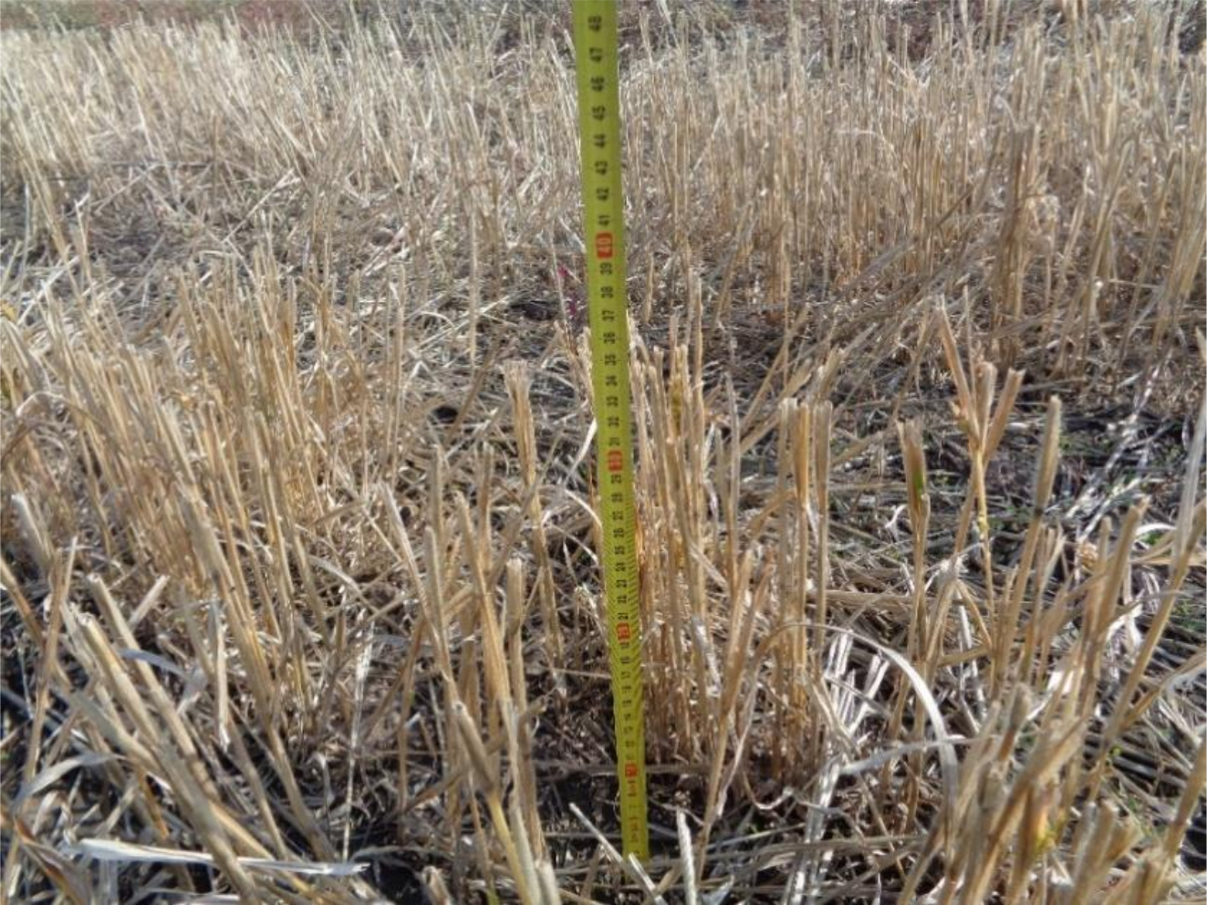 Материал и методы исследований. Перед началом экспериментальных исследований определяли среднюю высоту растительных и пожнивных остатков на поле (рис. 1). Замеры проводились на учетных площадках пяти участков, расположенных по диагонали загона, путем наложения рамки размером 1м×3м. В пределах каждой учетной площадки подсчитывали количество стерни и растительных остатков и производили по 10 измерений с погрешностью ±0,5 см.