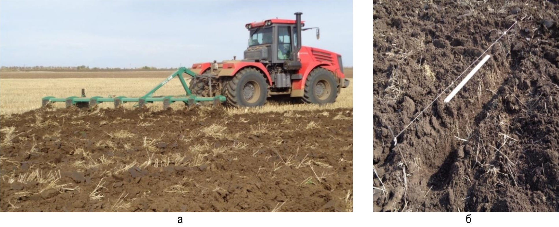 Рис. 3. Исследование заделки стерни: а) вспашка плугом ПБС-8М; б) профиль пахотного слоя