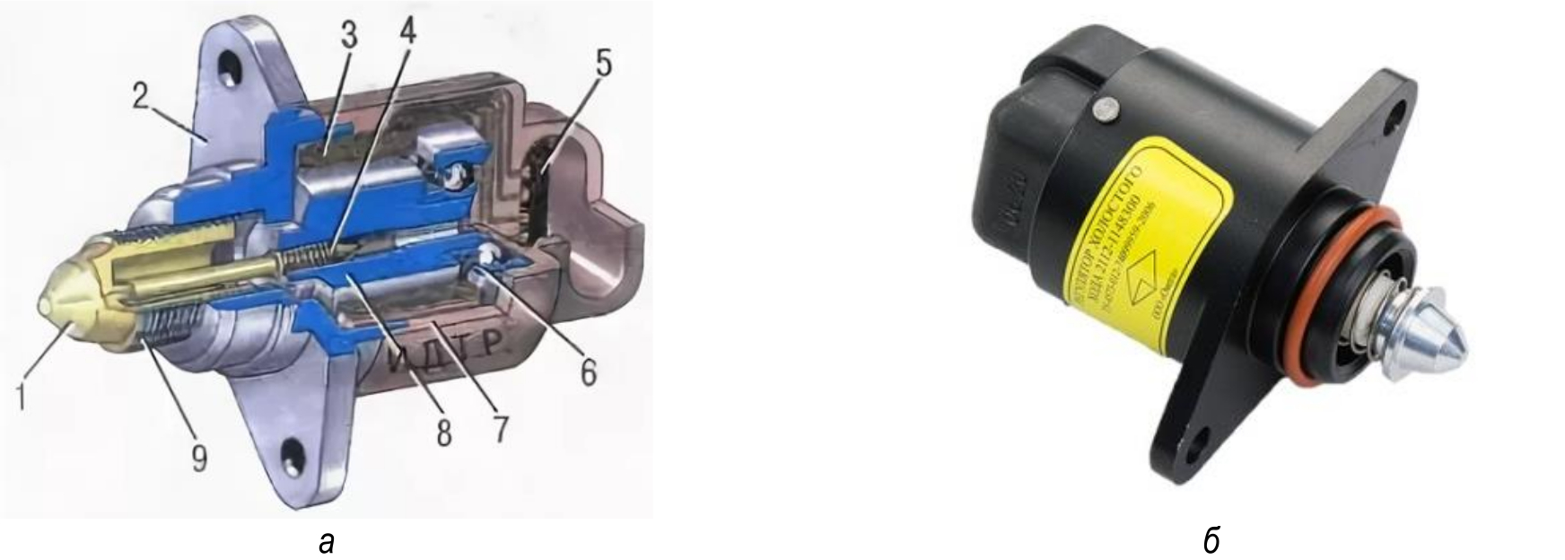 а – разрез; б – общий вид; 1 – клапан; 2 – корпус электродозатора; 3 – обмотка статора; 4 – ходовой винт (шток); 5 – штекерный вывод обмотки статора; 6 – шариковый подшипник; 7 – корпус обмотки статора; 8 – ротор; 9 – резьбовое соединение