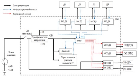 MPU – микроконтроллер; ОВ – основной выключатель (переключатель вкл./выкл. электропитания МБУ); Д1 – датчик температуры охлаждающей жидкости; МС Д1 – модуль согласования датчика температуры охлаждающей жидкости; Д2 – датчик частоты вращения коленчатого вала дизеля; МС Д2 – модуль согласования датчика частоты вращения коленчатого вала дизеля; Д3 – датчик положения рейки ТНВД; МС Д3 – модуль согласования датчика положения рейки ТНВД; Д4 – датчик температуры RМ; МС Д4 – модуль согласования датчика температуры RМ; ЭД (ДТ) – электродозатор ТНДТ; МС ЭД1 – модуль согласования электродозатора ТНДТ; ЭД (RM) – электродозатор RМ; МС ЭД2 – модуль согласования электродозатора RM; ЭН (ДТ) – электронасос ТНДТ; ЭН (RM) – электронасос RМ; МС ЭН1 и МС ЭН2 – модули согласования электронасосов ТНДТ и RM
