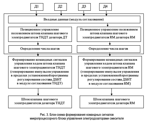 Генерирование командных сигналов для включения шаговых электродвигателей электродозаторов ТНДТ и RM в пределах регулирования состава ДБНТ осуществляется на основании заданных в программе микроконтроллера базы исходных информативных сигналов и текущих (записанных в памяти микроконтроллера) положениях штока клапанов электродозаторов ДТНТ и RМ. Величина информативных (входных) сигналов принята по данным паспортных градуировочных характеристик датчиков, а командных (выходных) сигналов для управления ходом штоков клапанов электродозаторов ТНДТ и RM по числу шагов (количеству импульсов напряжения). Микроконтроллер МБУ работает в соответствии с разработанным алгоритмом и программой, составленной на языке программирования «Си». Импульсные сигналы с МБУ поступают в цепь шаговых электродозаторов таким образом, что шток клапана растительного масла перемещается, например, в сторону открытия соответствующего входного канала смесителя, а шток клапана нефтяного топлива – в сторону закрытия.
