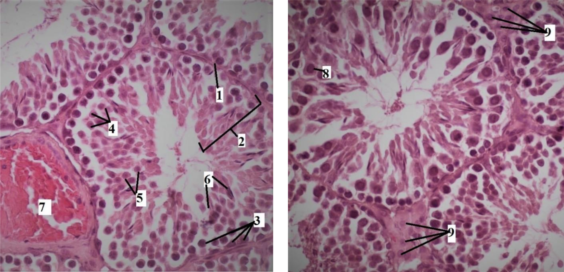 1 – базальная мембрана; 2 – сперматогенный эпителий; 3 – сперматогонии; 4 – сперматоциты; 5 – сперматиды; 6 – сперматозоиды; 7 – кровеносный сосуд; 8 – клетка Сертоли; 9 – клетки Лейдига (окраска гематоксилином и эозином. х100)