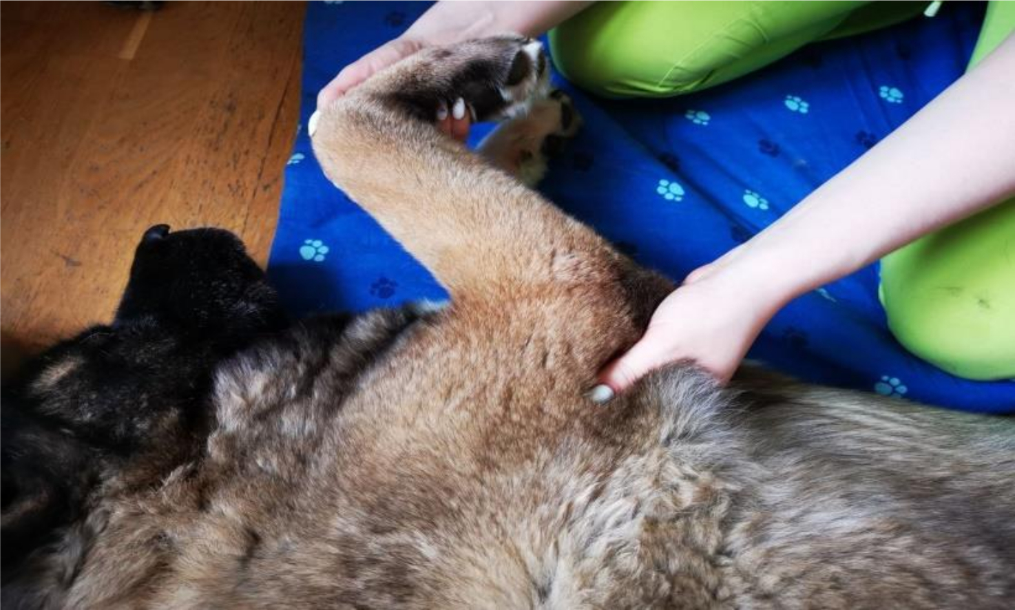 Когда собака лежала на боку с подложенным под плечо валиком из полотенца, который действует как точка опоры, к запястью и дистальному отделу предплечья применялось лёгкое надавливание и сопротивление. Прикладываемое сопротивление было небольшим, чтобы собака могла выполнять растяжку в течение всего времени без боли или мышечного спазма. Интенсивность техники растяжения и мобилизации ограничивалось заживлением поражённых тканей. Криотерапия использовалась для уменьшения воспалительного процесса [10]. Мы прикладывали лед вокруг всего локтевого сустава на 15-20 минут 3-6 раз в день.