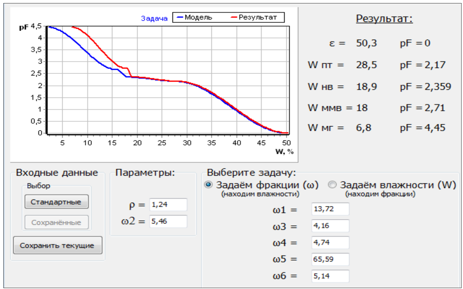 Рис. 1. Нахождение значений влажностей по заданным фракциям гранулометрического состава почвы