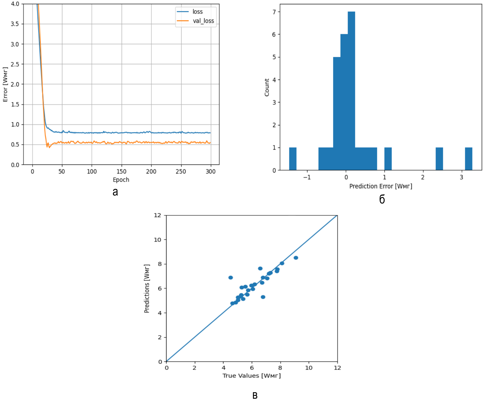Валидационная кривая, позволяющая проверять работоспособность модели в графическом виде, задает контроль функции потерь (loss). Для минимизации ошибки прогнозирования почвенно-гидрологических параметров была использована функция потерь (рис. 3а), которая позволила увидеть, что после 25 эпох получаем для параметра Wмг значения, близкие к тестовым данным. На рисунке 3б наблюдается количество весов, инициализированных с использованием распределения с нулевым центром, которые лежат в диапазоне значений от -0,8 до 0,8. На рисунке 3в видно, что большинство значений центрируются вокруг значения ноль, становясь больше или меньше примерно с равной вероятностью. Модель предсказывает достаточно хорошо прогнозируемый параметр.
