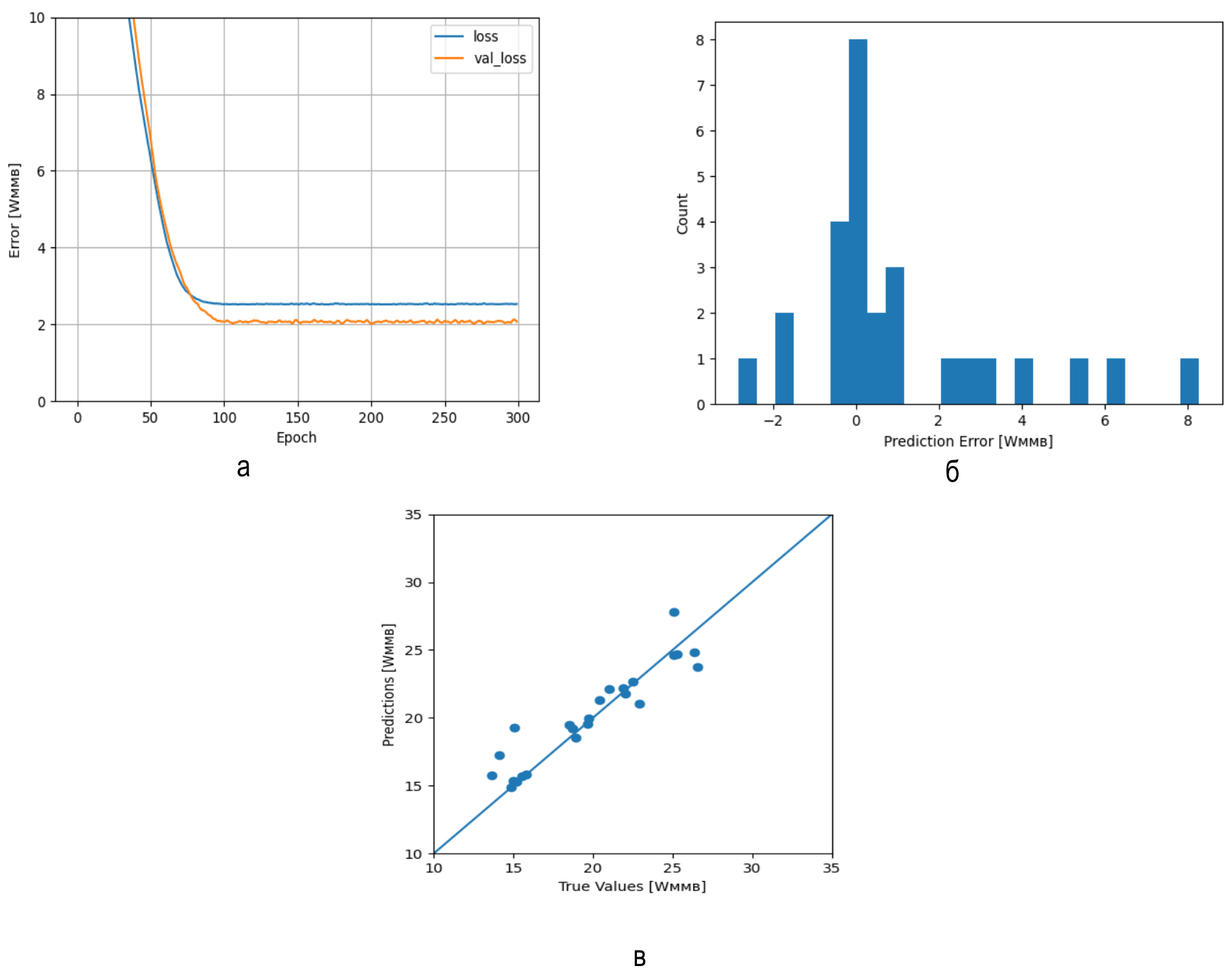 В случае с параметром Wммв, функция потерь принимает постоянное значение, начиная с 75 эпохи (рис. 4а). На рисунке 4б мы видим, что количество весов, с распределением нулевого центра, лежат в диапазоне значений от -0,5 до 1,0. Следовательно, разброс полученных данных небольшой в пределах допустимых ошибок. На рисунке 4в при сравнении прогнозируемых данных со значениями, полученными в результате обучения сети, наблюдаются незначительные выбросы, но основные показатели центрируются вокруг значения ноль. Это говорит о достоверности прогнозной модели данного параметра.