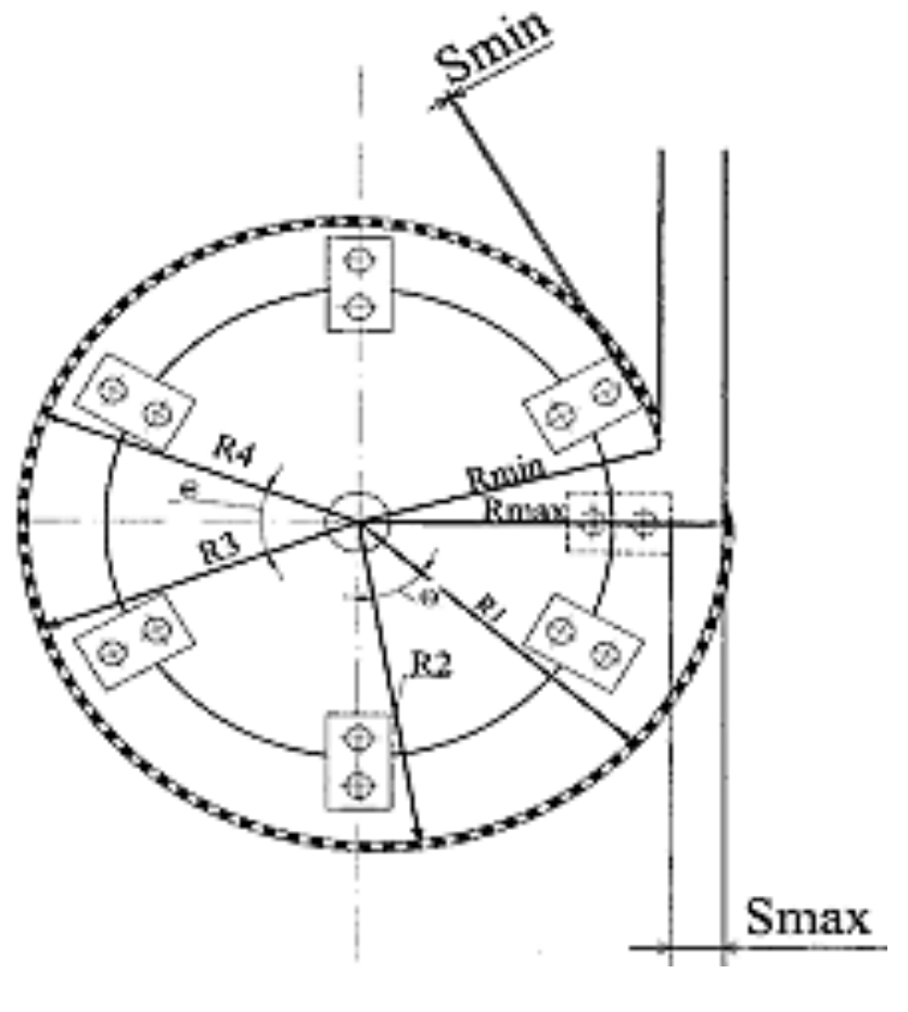 Примером подобных дробильных аппаратов является измельчитель Орловского ГАУ с переменным зазором между шарнирно подвешенными молотками и решетом [8]. В указанном материале выявлено влияние диаметра отверстий решет и увеличения радиуса спирали на энергоемкость получения дерти.