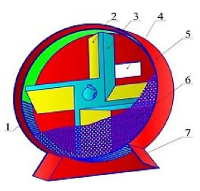 Рис. 2. Схема дробилки зерна с билами: 1 – решето; 2 – лопастное било; 3 – ротор; 4 – загрузочное окно; 5 – корпус дробилки; 6 – решето торцевое; 7 – окно выгрузное [11]