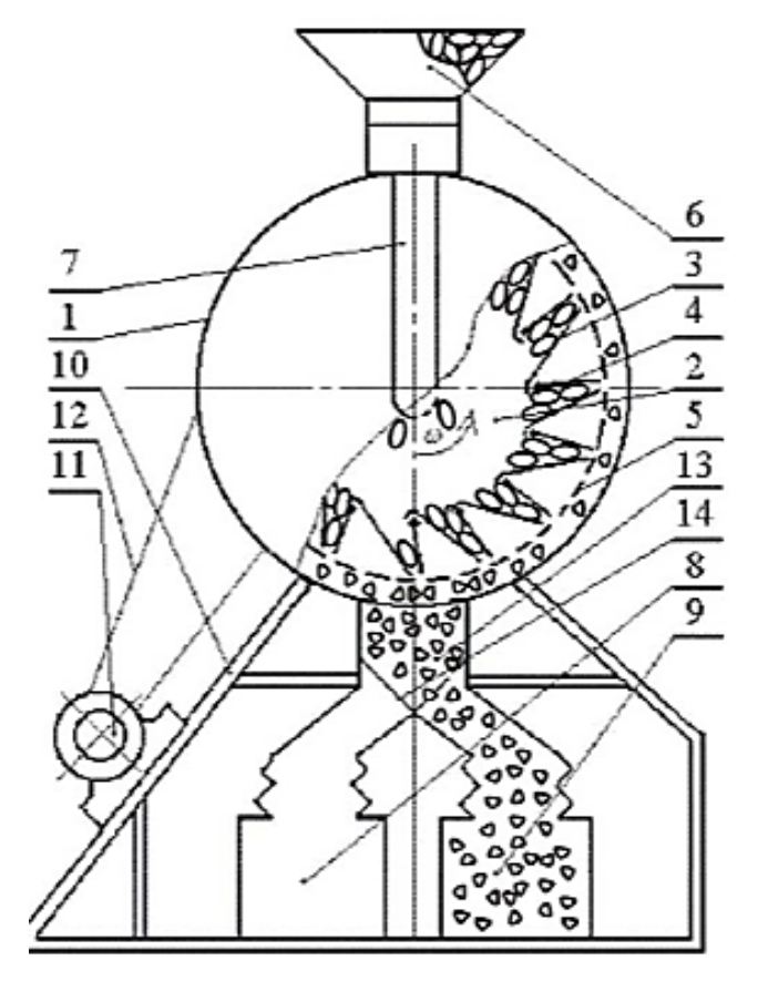 Рис. 4. Схема центробежной дробилки зерна: 1 – корпус дробильной камеры; 2 – ротор; 3 – неподвижная лопасть ротора; 4 – подвижная лопасть ротора; 5 – решето; 6 – загрузочный бункер; 7 – канала загрузочный; 8, 9 – емкость измельченного продукта; 10 – рама; 11 – электродвигатель; 12 – клиноремённая передача; 13 – выгрузная горловина; 14 – направляющая пластина [17]