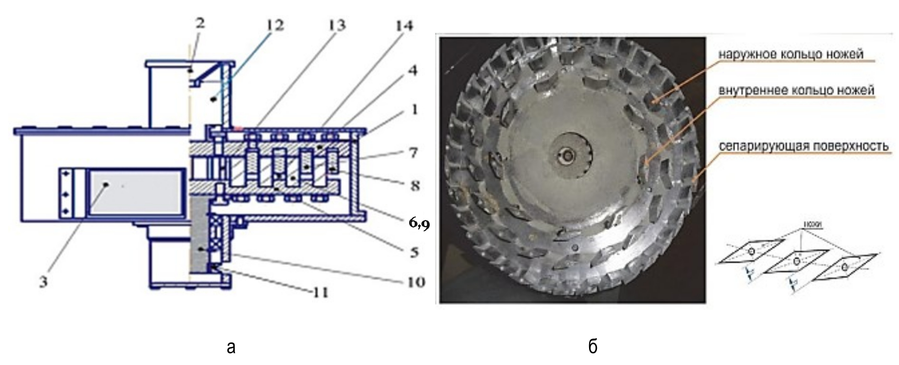 Рис. 5. Схема центробежно-роторного дробильного аппарата: а – конструктивная схема; 1 – корпус дробилки; 2 – патрубок загрузочный; 3 – патрубок выгрузной; 4 – статор (верхний диск); 5 – ротор (нижний диск); 6 – кольцевые каналы; 7 – ножи; 8 – наружный ряд ножей; 9 – сквозные пазы; 10 – приводной вал; 11 – шкив; 12 – горловина загрузная; 13 – окна радиальные; 14 – рабочая камера; б – общий вид верхнего диска измельчителя с сепарирующей поверхностью и установленными ножами и схема контроля открытия сепарирующей поверхности [21]