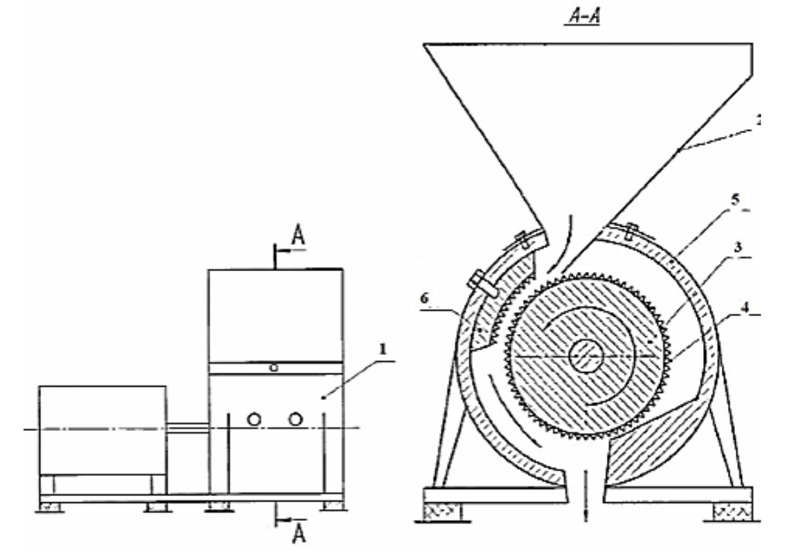 Рис. 6. Схема роторного измельчителя скалывающего типа: 1 – корпус; 2 – бункер; 3 – ротор; 4 – зубья ротора; 5 – кожух камеры измельчения; 6 – дека зубчатая [7]