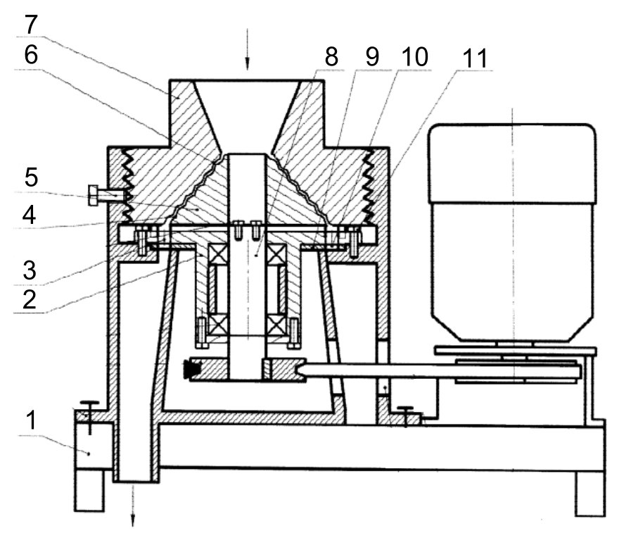 Рис. 7. Конусная инерционная дробилка: 1 – корпус; 2 – пластина-дозатор с технологическим отверстием; 3 – технологическое отверстие; 4 – правая навивка внутреннего конуса; 5 – внутренний конус; 6 – левая навивка наружного конуса; 7 – наружный конус; 8 – вал приводной; 9 – прокладка; 10 – технологическое отверстие; 11 – регулирующая пластина [24]