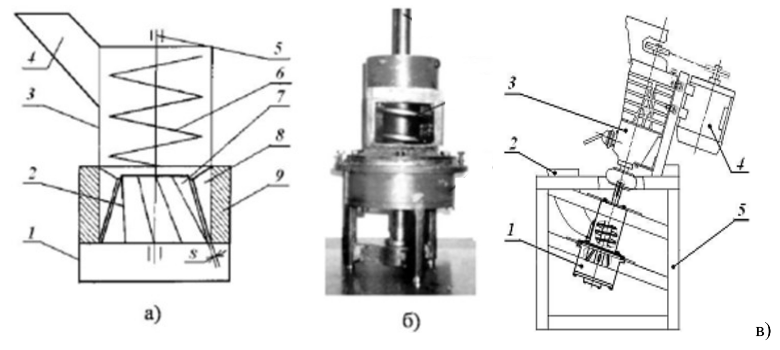Рис. 9. Конусная инерционная дробилка фуражного зерна: а – схема измельчающего аппарата; S – кольцевой зазор; 1 – выгрузная камера; 2 – лезвия ножевого конуса; 3 – загрузочная камера; 4 – загрузочный бункер; 5 – приводной вал; 6 – подающий шнек; 7 – ножевой конус; 8 – противорежущие элементы корпуса; 9 – корпус измельчителя; б – общий вид измельчающего аппарата; в – схема установки: 1 – измельчающий узел; 2 – загрузочный бункер; 3 – редуктор; 4 – электродвигатель; 5 – рама [27]