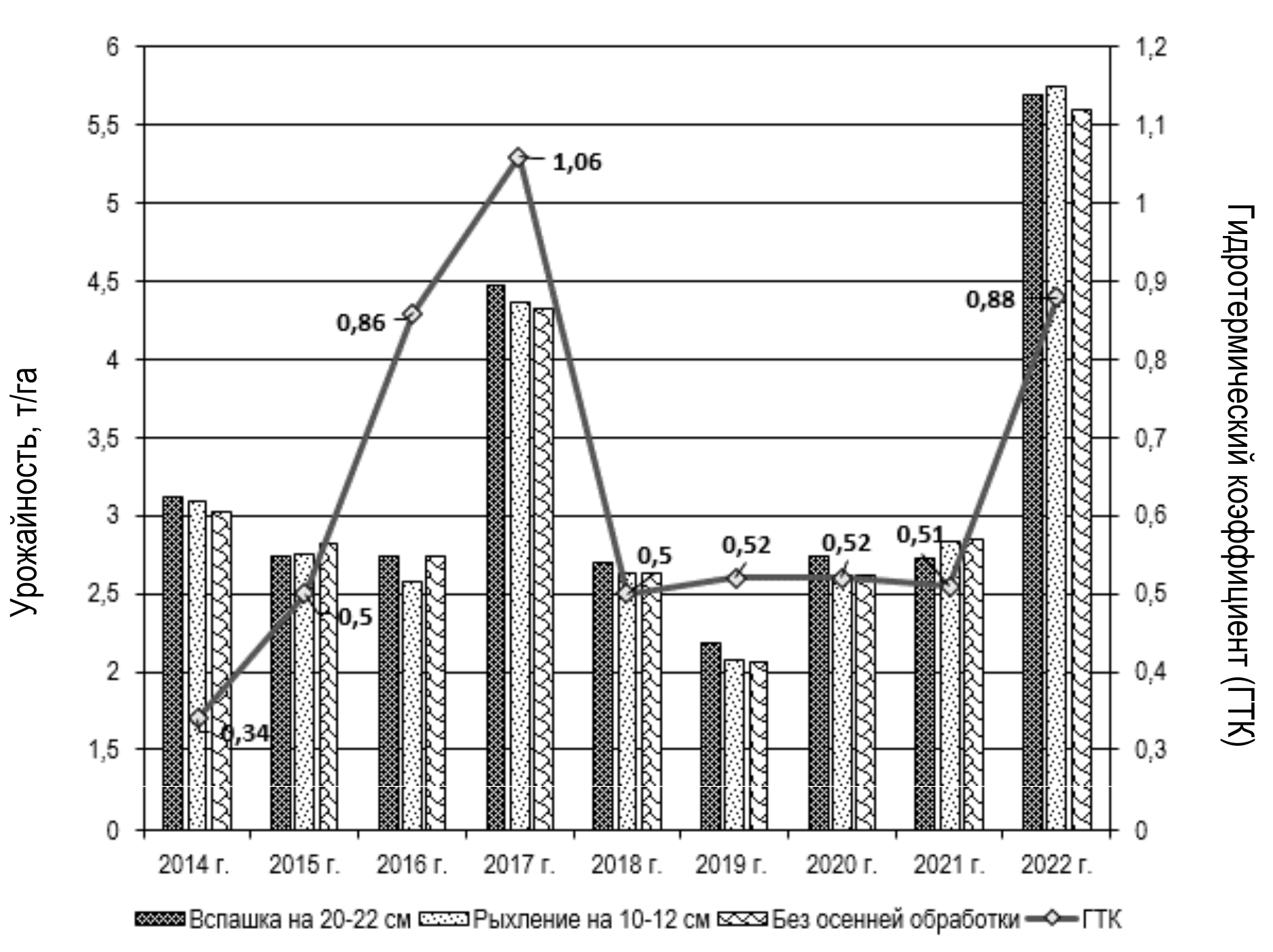 Период активной вегетации озимой пшеницы, характеризующийся как засушливый с ГТК=0,5, способствовал получению невысоких показателей урожайности озимой пшеницы, изменяющихся по годам от 2,06 до 2,85 т/га. В 2014 г. (ГТК=0,34) ранневесенняя засуха не оказала значительного влияния на урожайность пшеницы, так как сложившиеся условия для налива зерна были благоприятные. По сравнению с годами при значении ГТК=0,5 урожайность в 2014 году в среднем возрастала на 0,31 т/га. В 2016 году при ГТК=0,86 урожайность озимой пшеницы составляла в среднем 2,77 т/га, на что сказалась недостаточная влагообеспеченность растений осенью и неустойчивый температурный режим в начале зимнего периода, создающие напряженность для нормального осеннего развития и перехода в период покоя озимых культур. Однако дальнейшие условия зимнего периода благоприятствовали нормальной перезимовке. Наибольшая урожайность озимой пшеницы была получена в сложившихся слабо засушливых условиях 2017 г. (ГТК=1,06) и 2022 г. (ГТК=0,88), чему способствовало весенняя теплая погода и обильное выпадение осадков (в 2,2 раза больше среднемноголетнего значения), несколько пониженный температурный режим в начале июня (ниже нормы на 2,2°С) и количество осадков выше нормы.