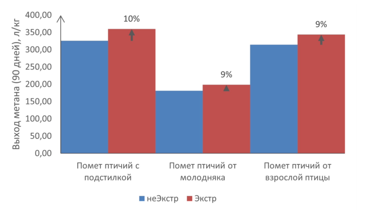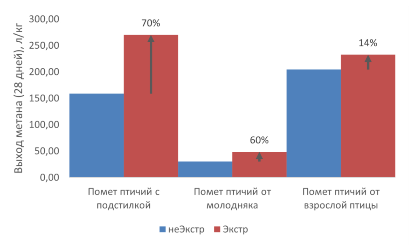 Экструзия твердой фракции помета вызывала большее увеличение выхода метана, при получении твердой фракции из навоза, прессованного шнековым способом. Через 28 дней все три фракции помета показали статистически значимое увеличение выхода метана. Через 90 дней все твердые образцы, полученные шнековым прессованием, показали статистически значимое увеличение.