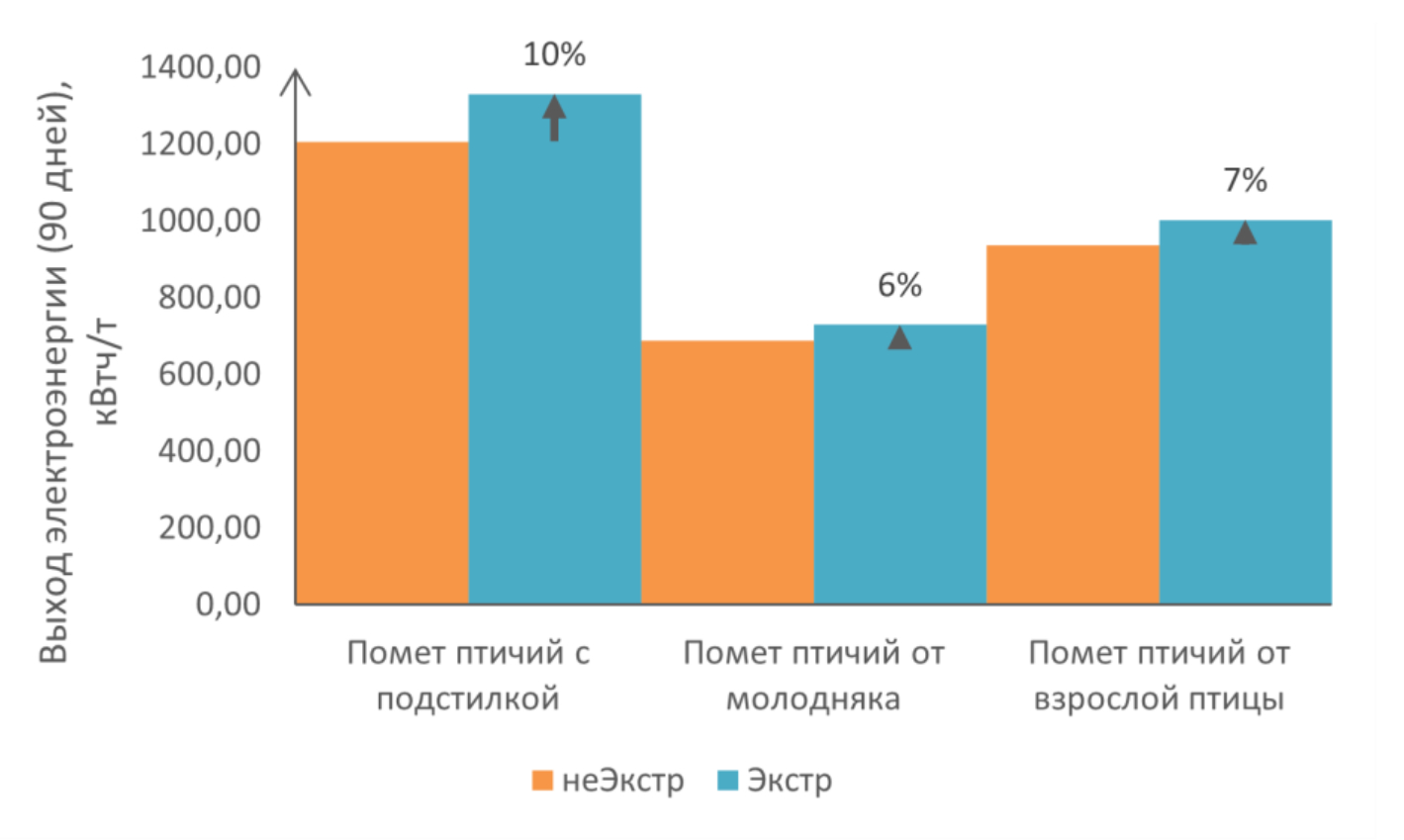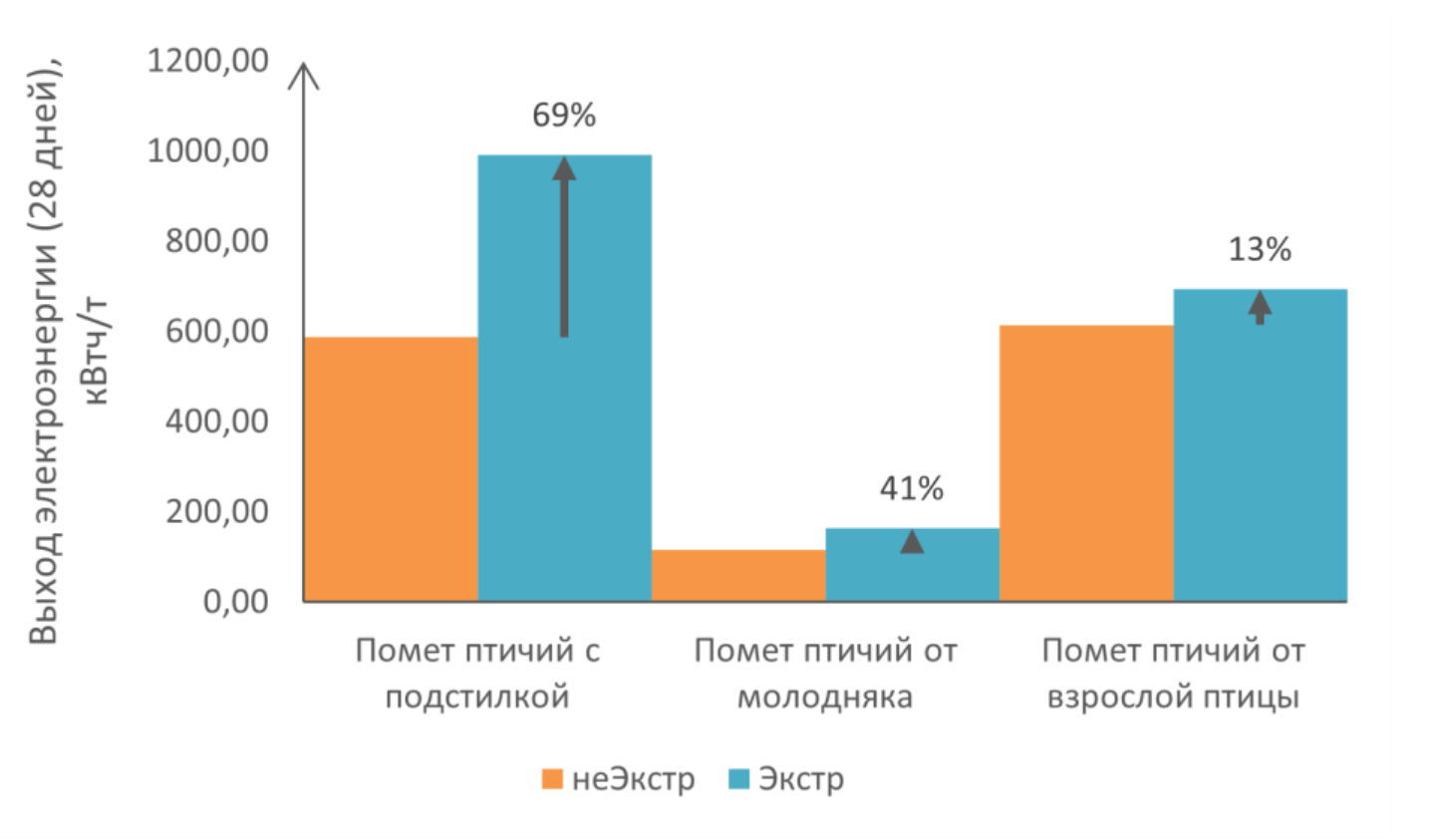Помет птичий с подстилкой и помет птичий от молодняка показали увеличение выхода электроэнергии на 69 и 41% через 28 дней и на 10 и 6% через 90 дней. Таким образом, в соответствии с данными о повышении выхода метана наиболее энергетически выгодной биомассой для экструзионной обработки является помет птичий с подстилкой.