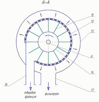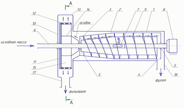 Декантер (рис. 1) это цельный корпус 1. Внутри корпуса размещён цилиндроконический осадительный ротор 2, имеются окна для выгрузки осадка 3 и выхода фугата 4. Вращение ротора происходит на коренных подшипниках 5, а так же питающей трубы 6 с окном 7, привода 8, шнека 9 для перевода осадка, который повторяет форму цилиндроконического осадительного ротора 2. Соосно цилиндроконическому осадительному ротору 2 размещено дополнительное устройство для обезвоживания осадка 10, представляющее из себя жёстко закреплённый неподвижный диск 11, на наружной стороне которого закреплён сектор фильтрования 12 с перфорированной поверхностью, закрытое кожухом 13. Внутри сектора фильтрования 12 расположен конусно-цилиндрический барабан 14. Он жёстко закреплён на оси вращения шнека 9 и своей конической частью упирается в окно для выгрузки осадка 3. На цилиндрической части барабана 14 выполнены жёстко закреплённые радиальные лопатки 15 для создания фильтрующей центробежной силы осадка П.Д. и очистки внутренней перфорированной поверхности сектора фильтрования 12. Фильтровальный сектор 12 имеет соединение с патрубком для вывода твёрдой фракции и патрубком 17 для выхода фильтрата. Для удаления фугата из зоны осаждения цилиндроконического ротора 2 декантер имеет сливной патрубок.
