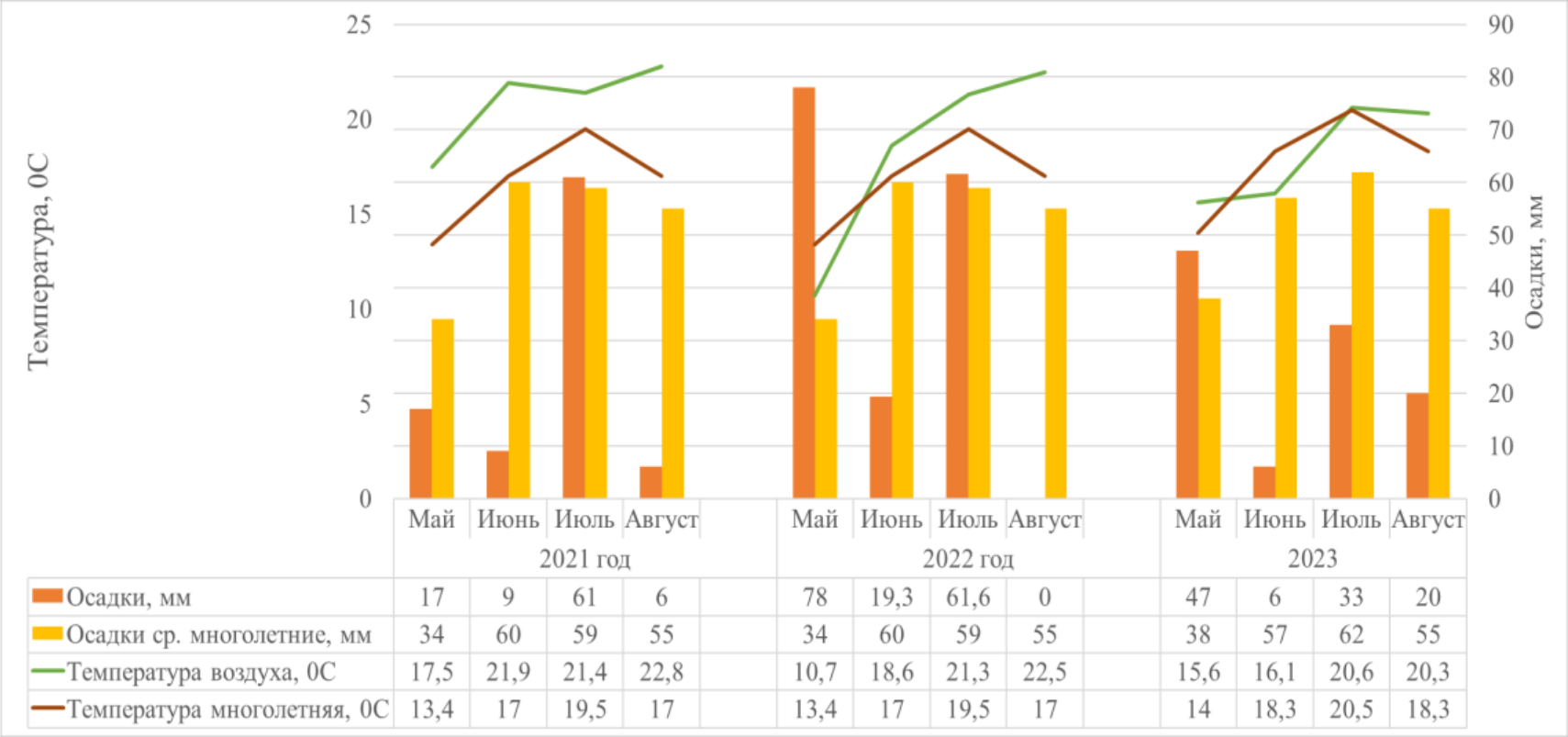 2023 год охарактеризовался ранним приходом весны, что позволило начать полевые работы раньше на 2 недели. Метеорологические условия года были засушливыми (ГТК – 0,8). Наблюдались повышенные температуры воздуха и отсутствие осадков в критические периоды развития растений.