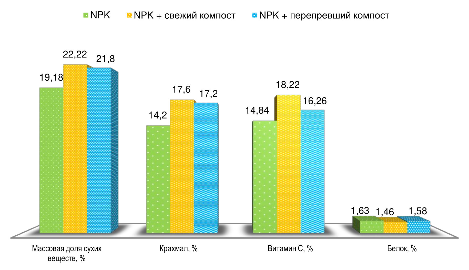 Оптимальное соотношение белка и крахмала наблюдается в клубнях с вариантов с внесением свежего компоста – 1:11 и перепревшего – 1:12, что свидетельствует о высоких кулинарных качествах. Применение органоминерального удобрения при выращивании картофеля оказало положительное влияние на содержание витамина С в сторону увеличения до 3,38%.