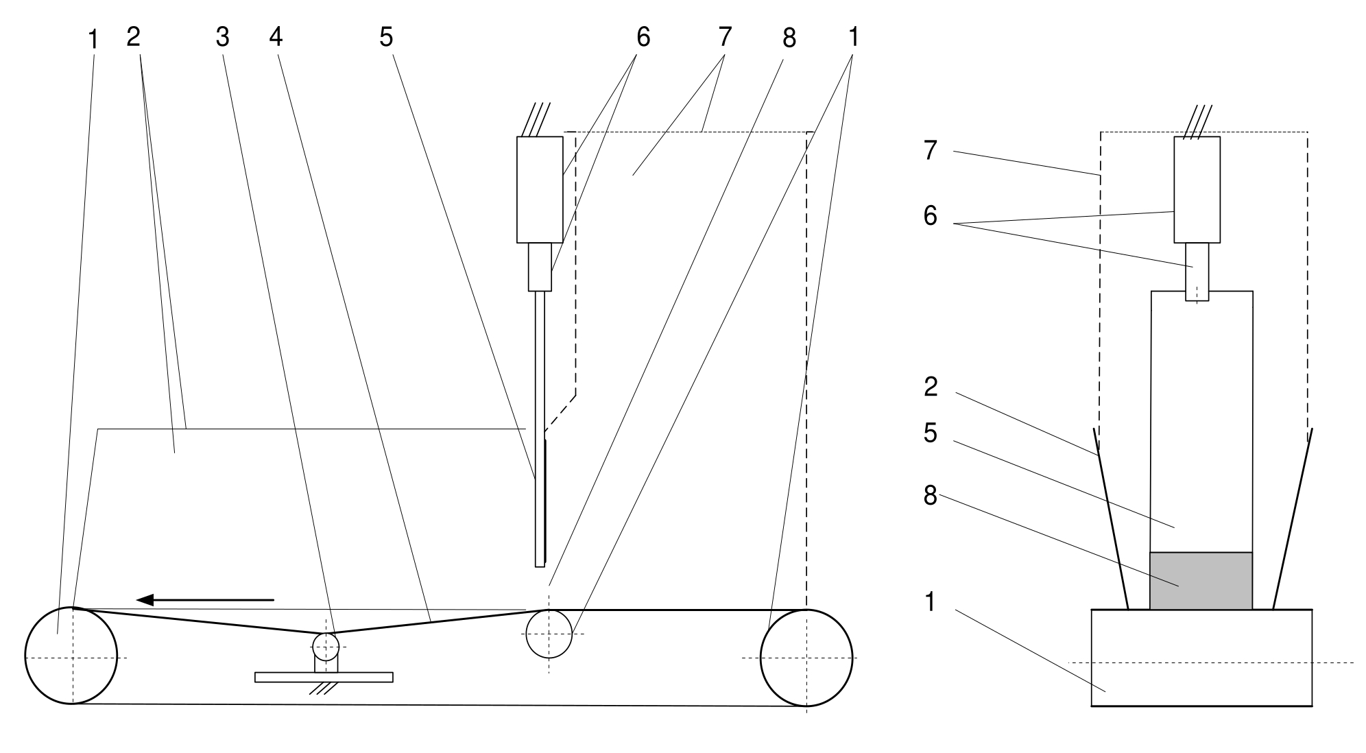 Рис. 1. Схема ленточного дозатора [23]: 1 – опорный ролик; 2 – борт; 3 – измерительное устройство; 4 – лента; 5 – заслонка; 6 – привод; 7 – бункер сыпучего материала; 8 – выгрузное окно