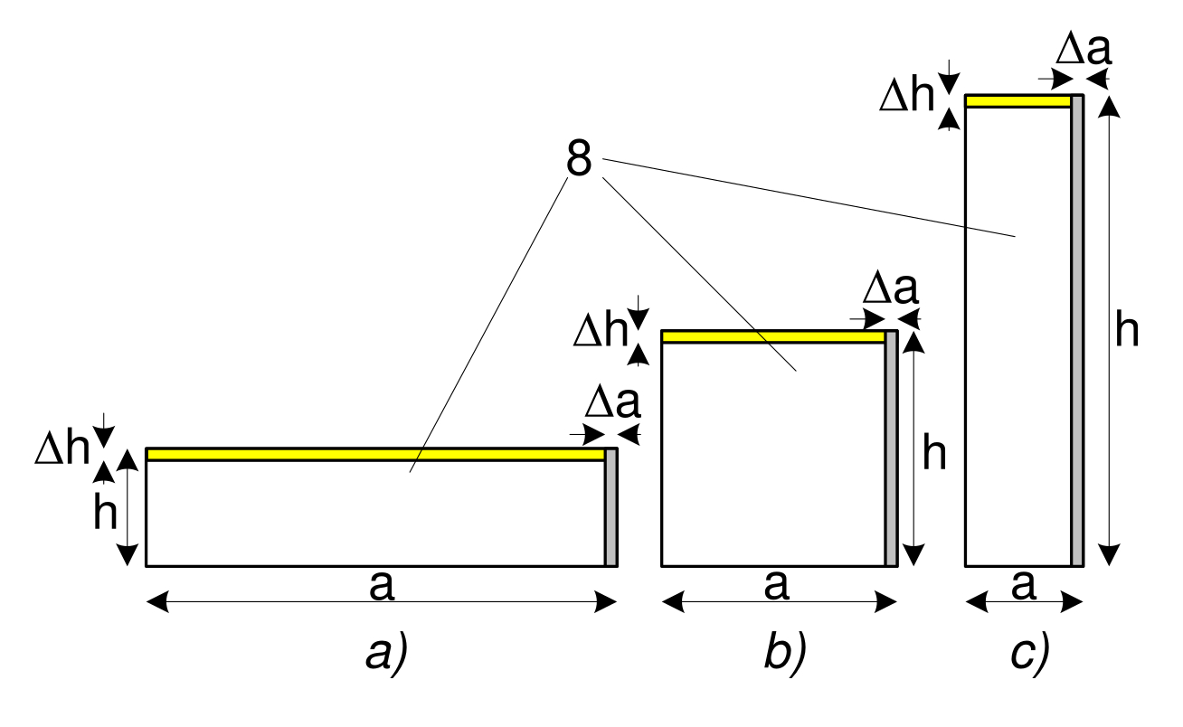 Рассмотрим влияние указанных погрешностей на точность обеспечения производительности. Для этого рассмотрим влияние изменения показателей в ф.1 на фактически используемые единицы измерения. В процессе изготовления дозатора и регулировании положения заслонки настройка производится с точностью до одного миллиметра. Соответственно и используем при численных исследованиях данный показатель. При этом при сохранении заданной площади выгрузного отверстия возможно изменение пропорций между шириной и высотой выгрузного отверстия (рис. 2. а, b, c). Погрешности размеров ширины Dа и высоты Dh выгрузного отверстия одинаковые (1 мм), однако в зависимости от пропорций выгрузного окна (рис. 2) погрешности производительности будут различными.