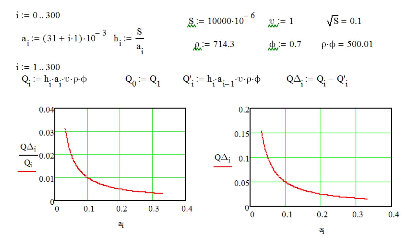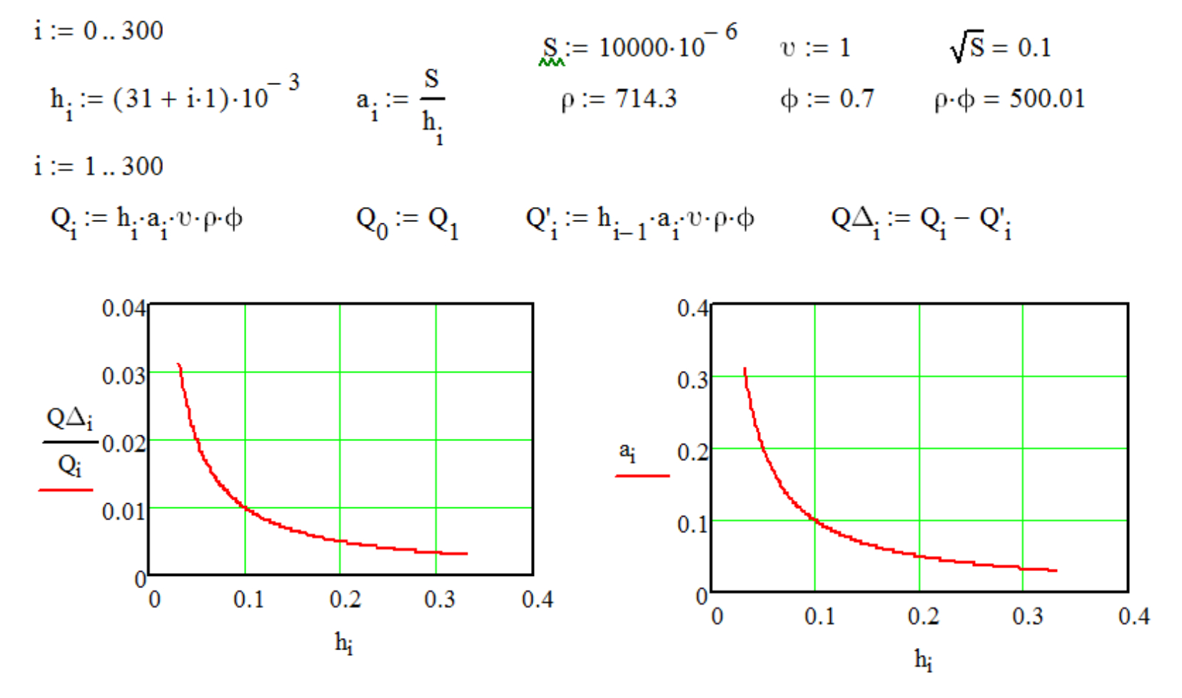 Рис. 3. Результаты моделирования показателя соотношения прироста производительности к производительности дозатора (QDᵢ/Qᵢ, доля) и выгрузного отверстия aᵢ (м) в зависимости от высоты выгрузного отверстия hᵢ (м) при постоянной площади выгрузного окна S