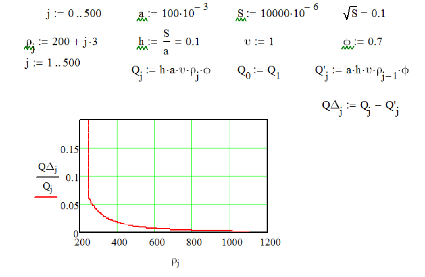 Рис. 6. Результаты моделирования соотношение прироста производительности к производительности дозатора (QDj/Qj, доля) в зависимости от плотности вороха материала (rj, кг/м³)