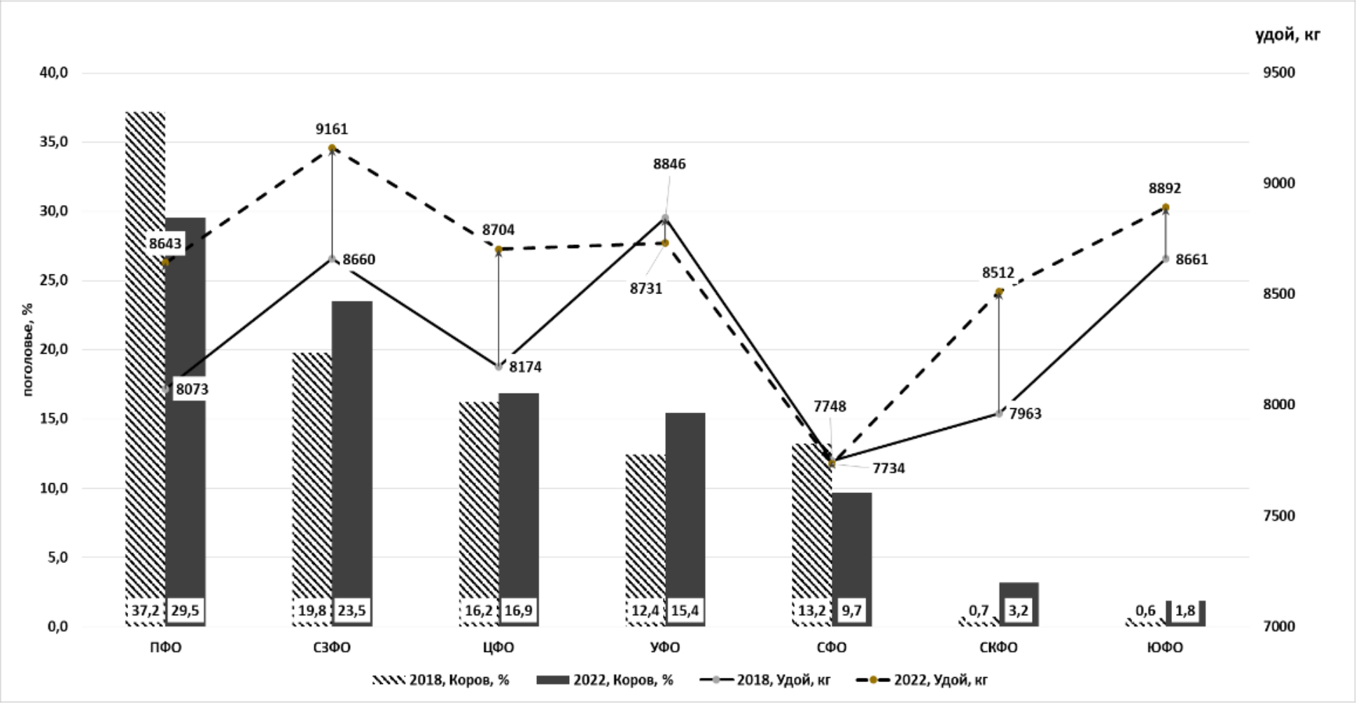 Самая большая численность коров черно-пестрой породы с законченной лактацией в племенных заводах и репродукторах до начала породной инвентаризации скота была в Приволжском Федеральном округе. Так, например, в 2018 году численность коров составляла 169 489 голов, в том числе в ПЗ – 57 312 голов, ПР – 112 177 голов. Продуктивность коров в племенных заводах 8 073 кг молока, содержание жира 3,90%, белка 3,19%, а в племенных репродукторах в среднем составляла 6 754 кг молока, содержание жира 3,92%, белка 3,16%. В 2022 году бонитировка показала, что племенных черно-пестрых коров в Приволжском Федеральном округе насчитывает 64632 голов (ПЗ – 10 291 голов, ПР – 54 341 голов, которое сократилось на -82,0 и -51,6% соответственно) с продуктивностью в племенных заводах 8 643 кг молока, содержанием жира 3,99%, белка 3,24%, а в племенных репродукторах – 7 310 кг молока, жир 3,96%, белок 3,22% соответственно. То есть удой вырос на +570 кг при увеличении жирности на +0,09% и белковости на +0,05%. Подобные же изменения отмечены в ПР - +556 кг, +0,04%, +0,06% соответственно. При этом незначительно снизился возраст в отелах (-0,16 и -0,06).