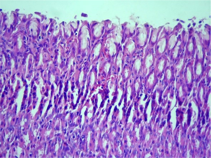 Животным из второй группы через 24 часа перорально через шприц вводили смесь 50мг гидроксида алюминия и 50мг инулина, разведенного в 1 мл водопроводной воды 2 раза в день: в 8:00 и 20:00 каждого дня в течении 6-ти дней. На 3-й и на 6-й день после начала эксперимента 10-ти животным из каждой группы проводили эутаназию путем перерезки спинного мозга под эфирным наркозом и осуществляли отбор гистологических материалов из разных отделов желудка (кардиальный, дно желудка, тело желудка и пилорический отдел), который фиксировали в 10% формалине, в соотношении 1:10. Пробы заливали в парафин, срезы (3-4 мкм) делались на ротационном микротоме, наносились на стекла с адгезивным покрытием (яичный альбумин), окрашивали эозином и гематоксилином и оценивали при световой микроскопии. Цифровые изображения гистопрепаратов получены с использованием микроскопа AxioImager.A2 и фотокамеры AxioCamMRc5 (Zeiss, Germany).