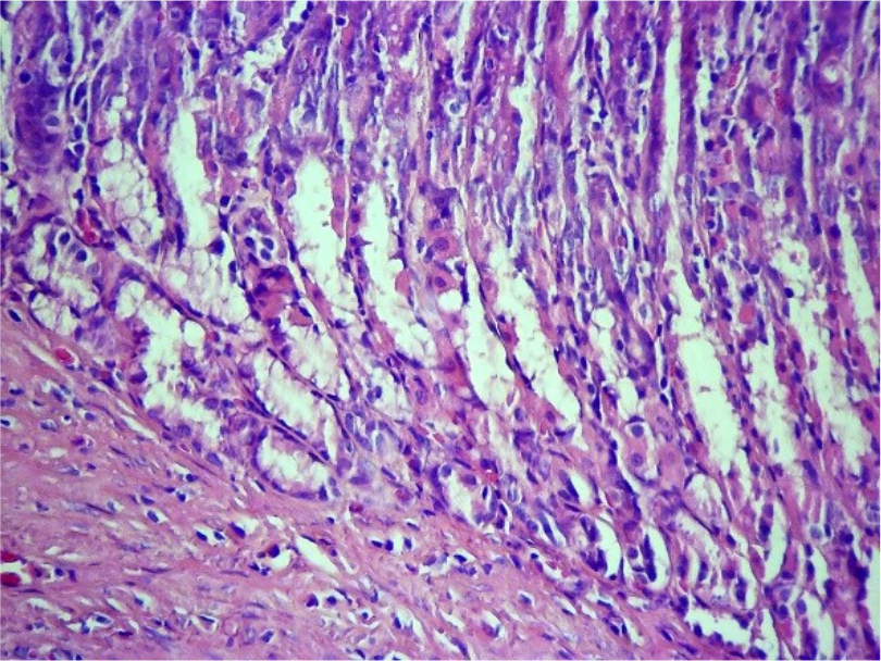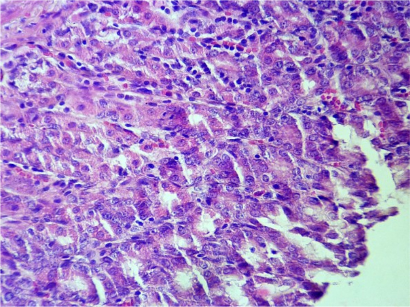 Рис. 2. Атрофия экзокриноцитов желез слизистой оболочки желудка. Ув. ×400