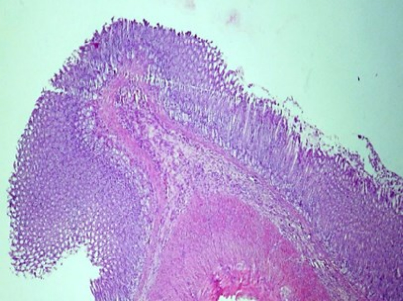 Изменения на 6-й день у животных из первой группы свидетельствуют о присутствии крупных фокусов глубокого некроза и слущивания эпителия, смешанного со слизью. Подслизистая основа в состоянии деструкции, гомогенезирована.