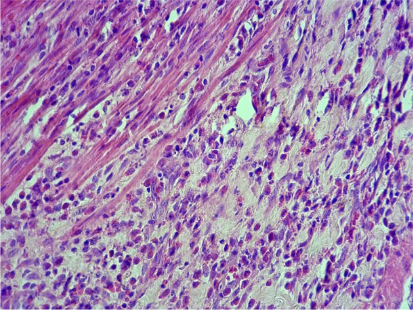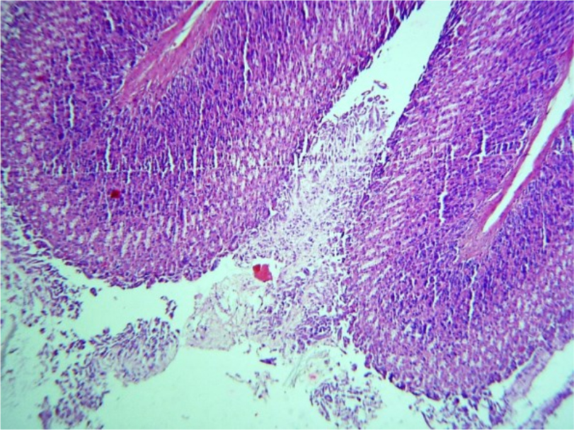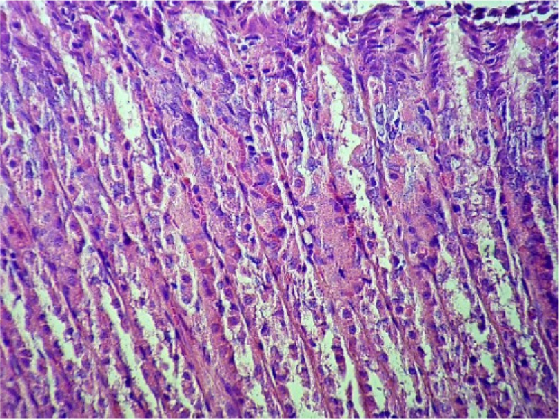 При проведении патоморфологического исследования животных из первой группы на 6-й день было выявлено, что стенка желудка имеет типичное строение, в слизистой оболочке присутствуют крупные фокусы дефекта - глубокого некроза и слущивания эпителия, смешанного со слизью (Рис. 3). Мышечная пластинка слизистой оболочки с очагами отека – мутная, гомогенизирована, имеет рыхлый вид. Подслизистая основа в состоянии деструкции, гомогенизирована, волокна стромы набухшие, разволокнены. Отек между волокнами обильные инфильтраты из эозинофилов, редких фибробластов. Отмечается, что инфильтрация эозинофилов распространяется и в мышечную пластинку (Рис.4). Кровеносные сосуды в состоянии гиперемии, микроциркуляторное русло в состоянии стаза