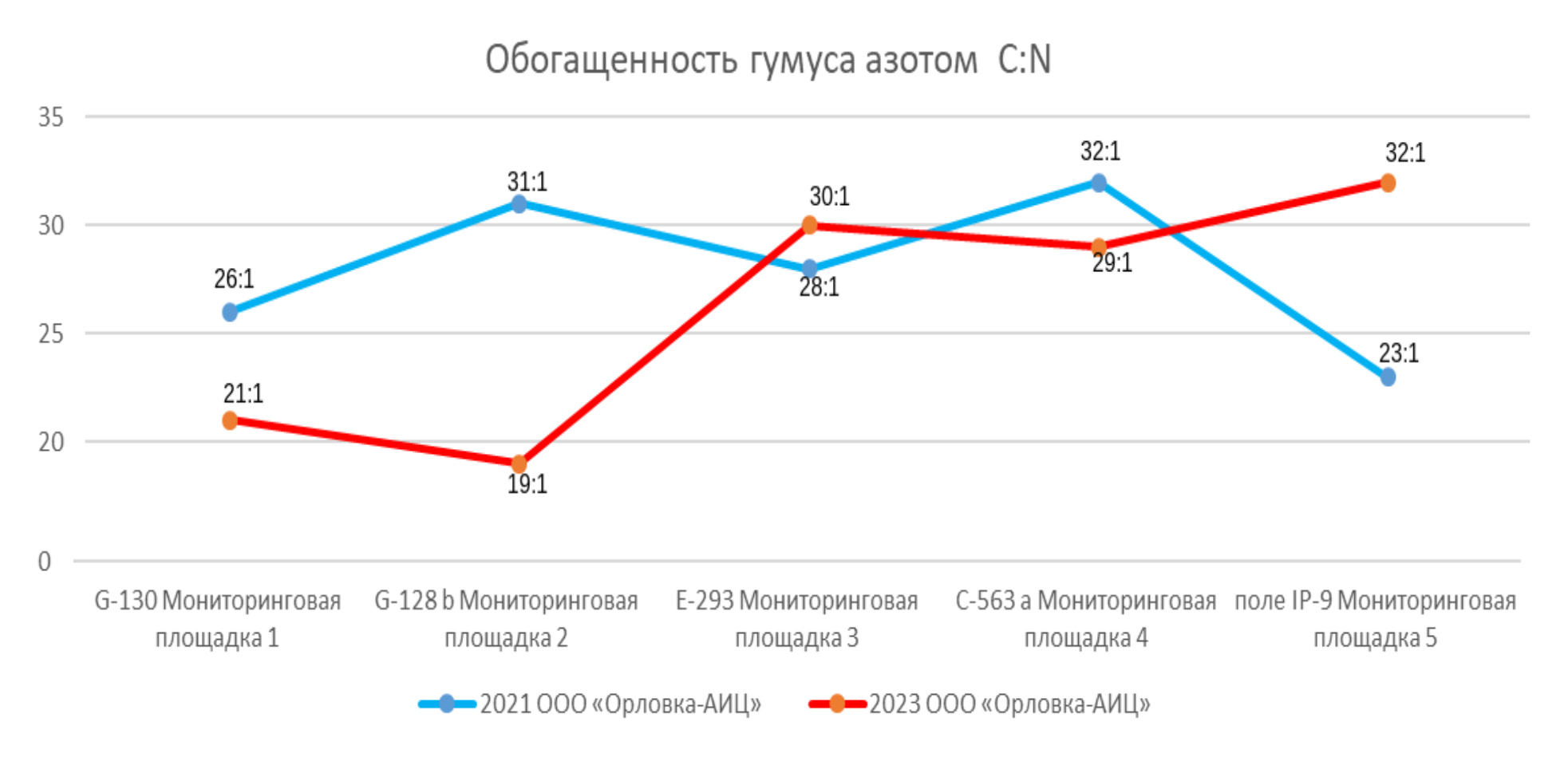 На мониторинговых площадках ООО «Орловка-АИЦ» полученные результаты соотношения C:N колебались в пределах 19-32 (рис. 1), что указывает на обогащение гумуса азотом и повышает его питательную ценность.