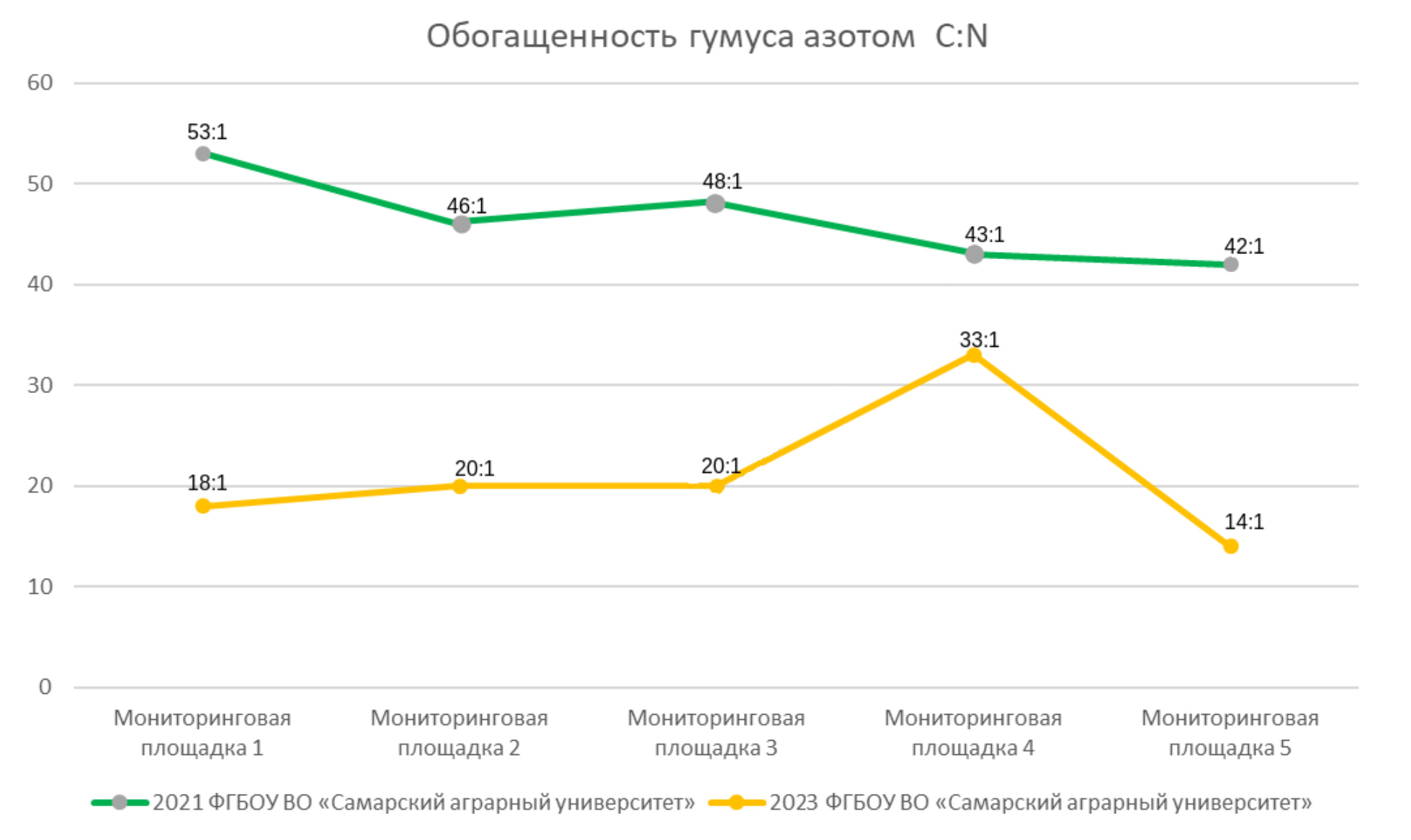 На мониторинговых площадках ФГБОУ ВО «Самарский аграрный университет» полученные результаты соотношения C : N колеблются в 2021 г. в пределах 42-53 (рис. 2), что свидетельствует о достаточном количестве в почве углерода и низком содержании азота. Однако по результату 2023 года произошло изменение в сторону обогащения гумуса азотом с колебанием C:N от 14 до 33, что указывает на повышение питательной ценности гумуса.