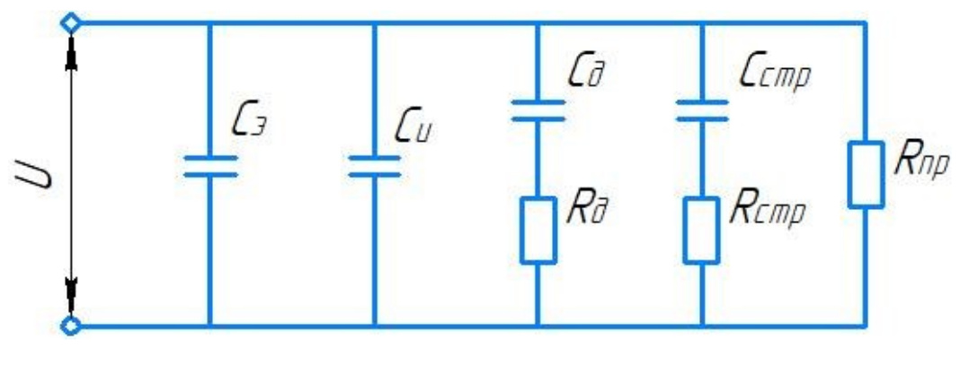Рис. 1. Эквивалентная электрическая схема замещения для лузги и ядра семян клещевины: Сэ – ёмкость, обусловленная электронной поляризацией; Си – ёмкость, обусловленная ионной поляризацией; Сд, Rд – ёмкость и сопротивление, обусловленное дипольной поляризацией; Сстр, Rстр – ёмкость и сопротивление, обусловленное структурной поляризацией; Rпр – сопротивление току сквозной проводимости