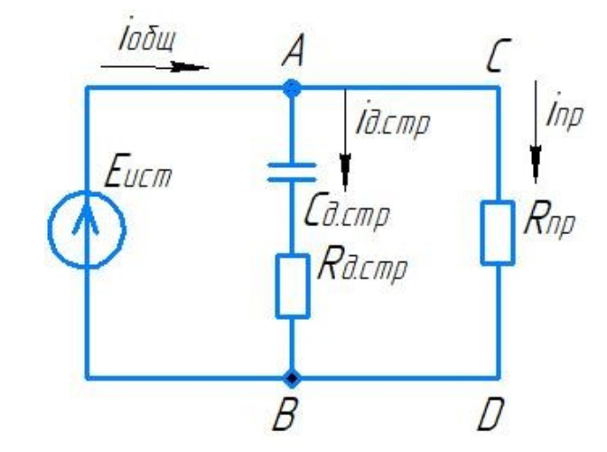 Рис. 3. Упрощенная эквивалентная электрическая схема замещения для ядра и лузги клещевины при подключении к источнику постоянной электродвижущей силы (э.д.с) Еист – источник постоянного тока