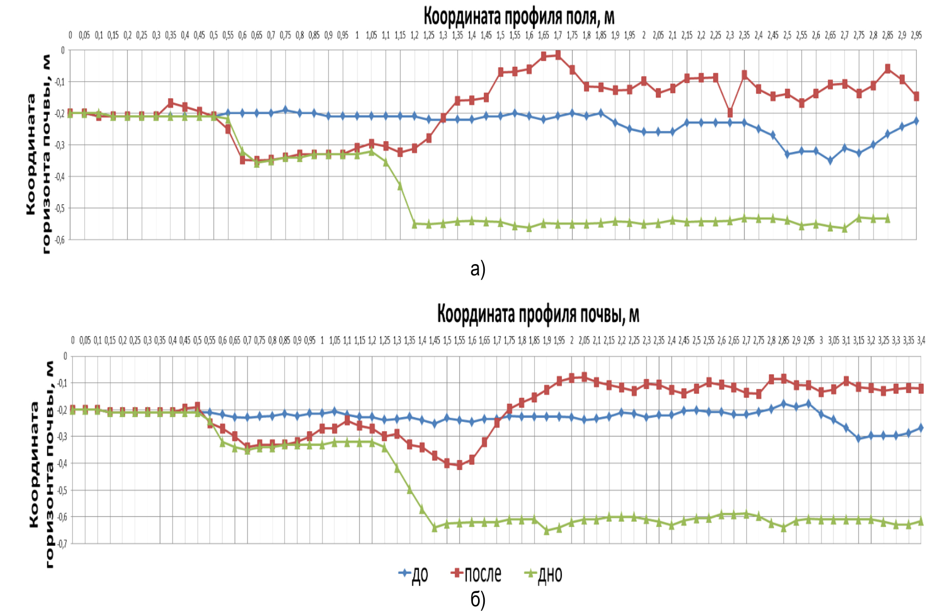 После обработки почвы на глубину 0,4 метра с использованием коминированного ярусного плуга (рис. 4, б), средняя гребнистость почвы составила 0,052 метра. Этот показатель соответствует агротехническим стандартам. Профиль неровностей дна подпахотного обработанного слоя почвы после прохода безлемешных рыхлительных корпусов нижнего яруса, образован в виде бороздок глубиной до 0,05 м, что не значительно превышает аналогичные допустимые показатели по агротехническим требованиям для лемешно-отвальных рабочих органов [9].