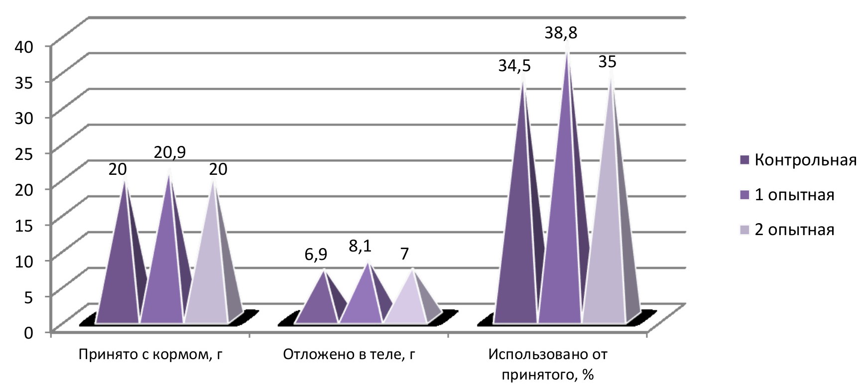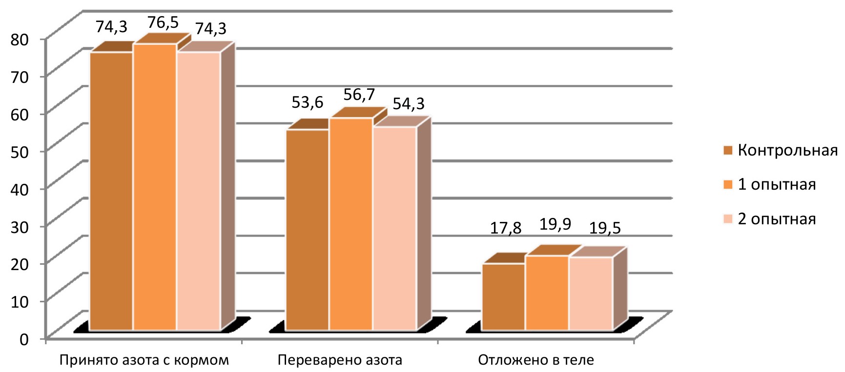 Так (рис. 1), животные группы контроля и 2 группы опыта потребили одинаковое количество азота с рационом - 74,3 г, что меньше, сравнительно с 1 группой опыта, - на 2,2 (3,0 %).